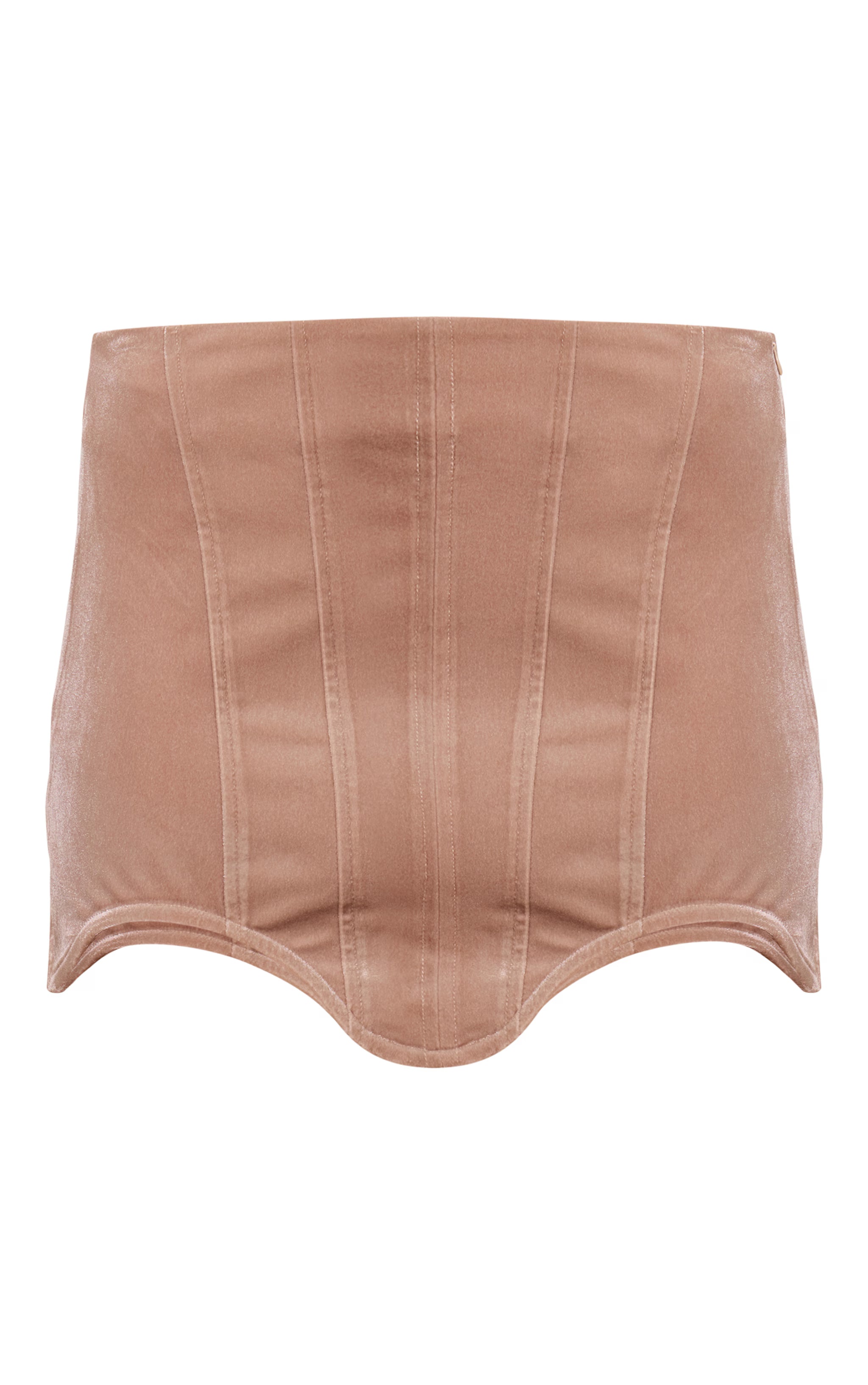 Your next evening rotation piece just landed. The sand velvet dip hem mini skirt redefines after-dark dressing with its directional design, featuring a structured mini silhouette and intricate corset-style seaming across the waist for a confident, contemporary edge. Style this standout piece with an oversized crisp white shirt and some sky-high nude heels, adding a sleek black shoulder bag to prove your style credentials for any sophisticated agenda.