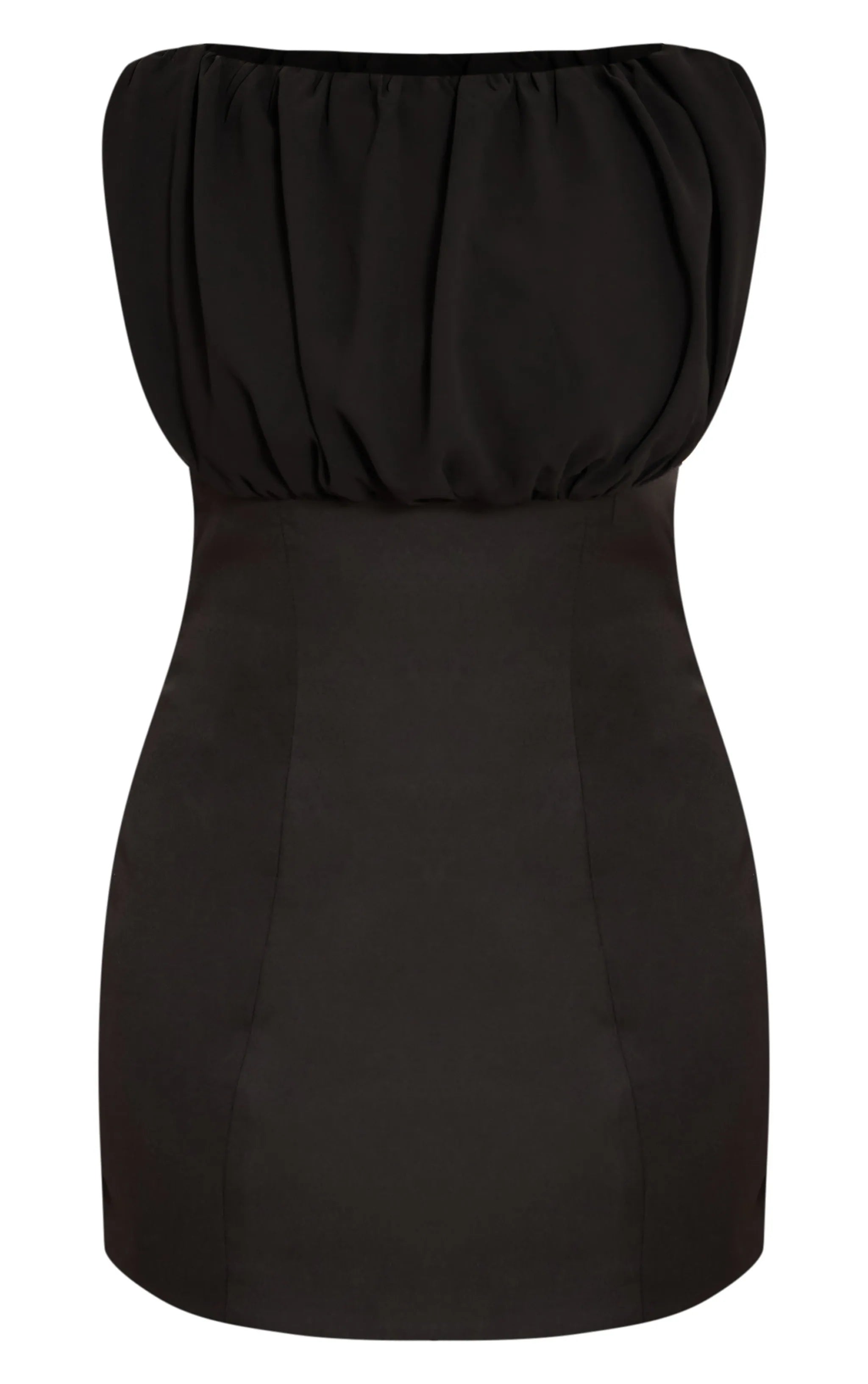 The shape black boat neck ruched front mini dress enhances your silhouette with its flattering cut and gathered detailing. The sleek boat neckline adds understated elegance. Pair with strappy heels and gold accessories for a refined evening outfit or layer under an oversized blazer for contemporary balance.