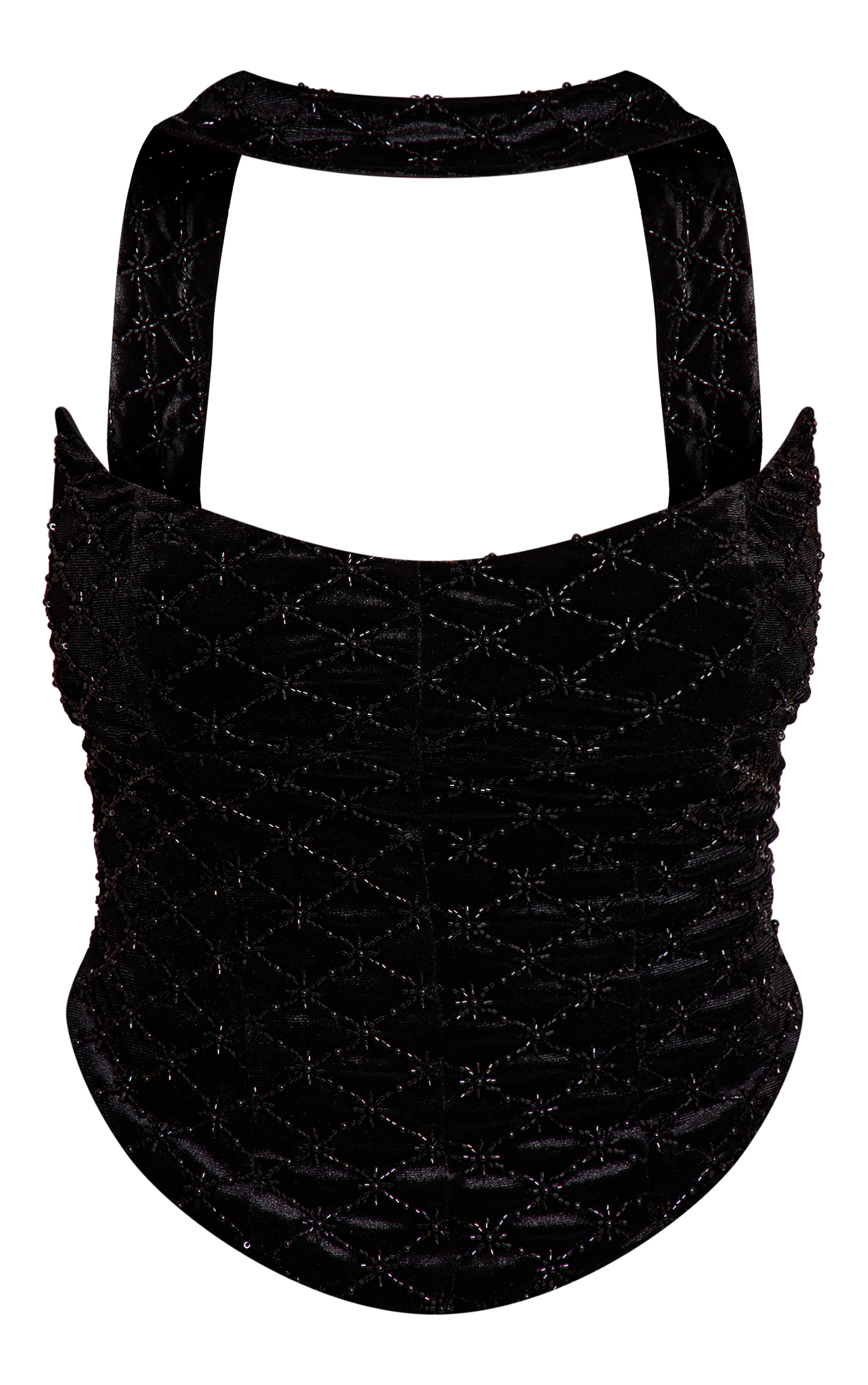Turn heads with a silhouette designed for impact. The shape black embellished chocker detail top defines occasionwear with its striking bandeau neckline, featuring sculpted pointed bust details. A matching integrated choker frames the décolletage, complemented by an all-over subtle shimmer that catches every light. Pair this distinctive piece with its matching embellished shorts for a cohesive two piece set aesthetic, elevating the look further with striking clear heels and a subtle gold ring. This ensemble ensures you command every moment from the moment you arrive.