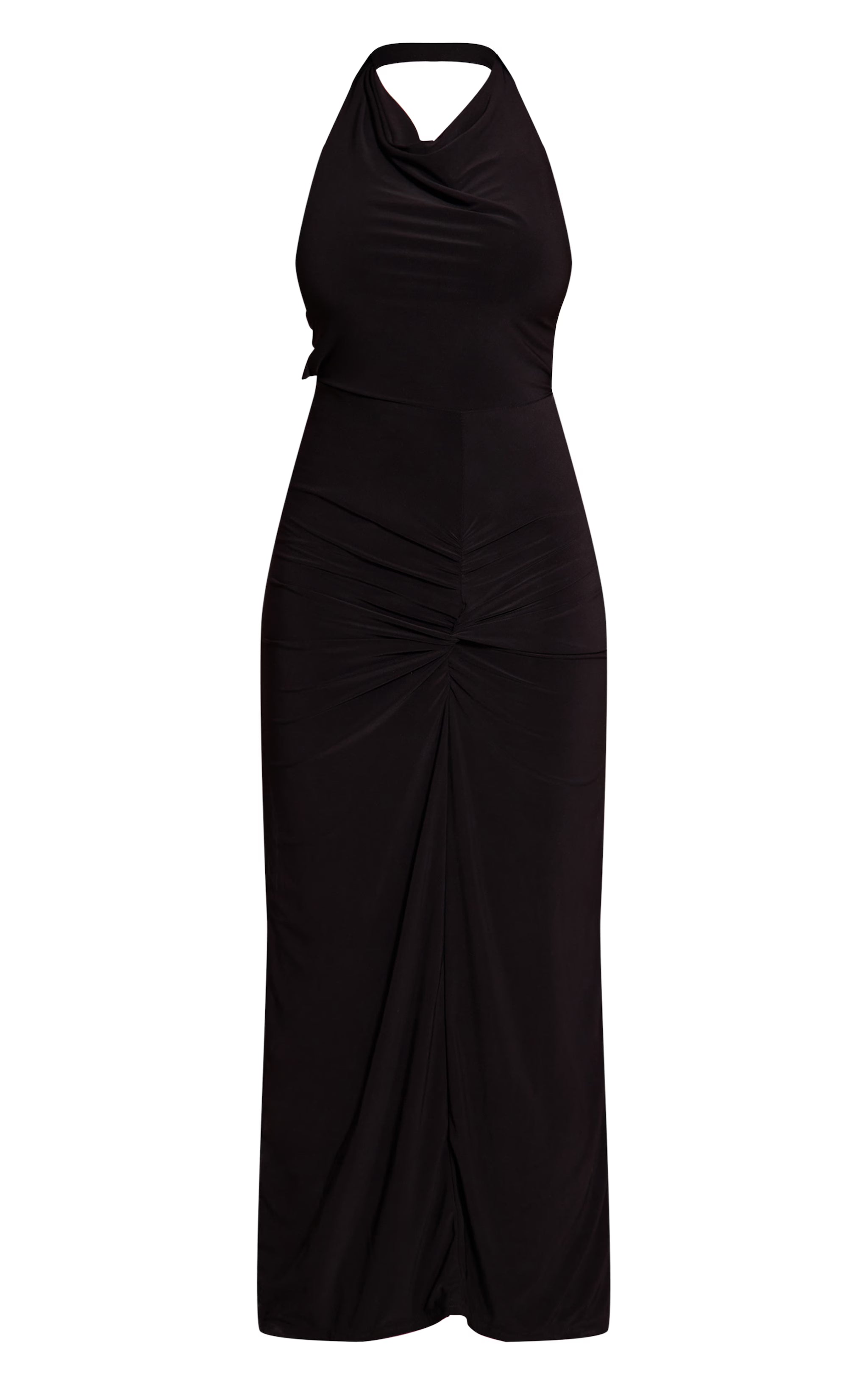 Make an entrance with the shape black halter neck tie back gold trim cowl maxi dress. Featuring a slinky cowl neckline, halter tie back, and luxe gold trim detail, this maxi exudes elegance. Pair with metallic heels and sleek hair for a standout look.