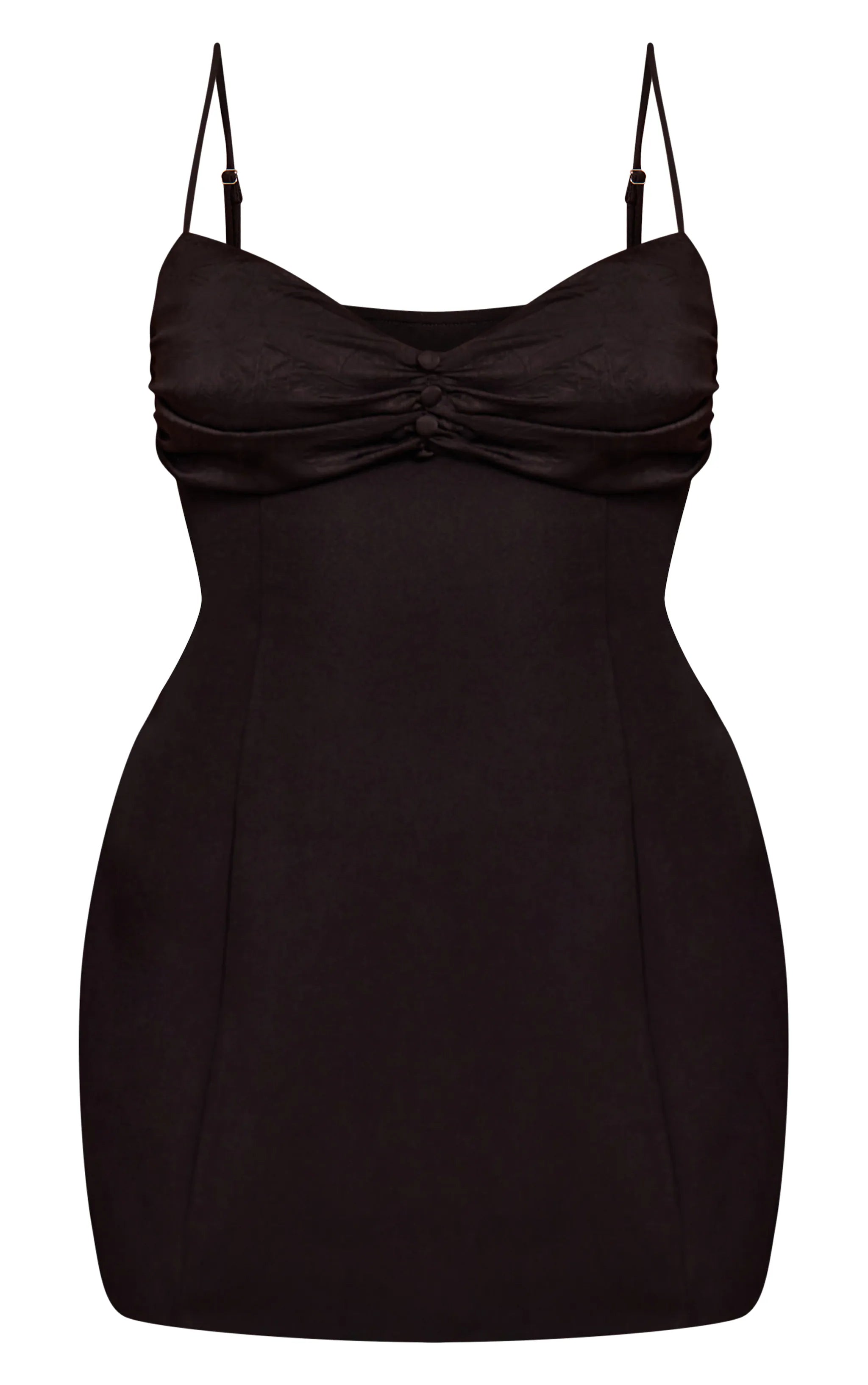 Command the night with effortless confidence. The shape black ruched satin bust button front mini dress is designed to make an impact, showcasing a sleek bodycon silhouette that defines every curve. Its distinctive ruched satin bust, accented by delicate button detailing and fine spaghetti straps, offers a refined focus. Elevate this essential black mini with statement platform heels and a bold gold ring for an evening look that speaks volumes without a whisper.