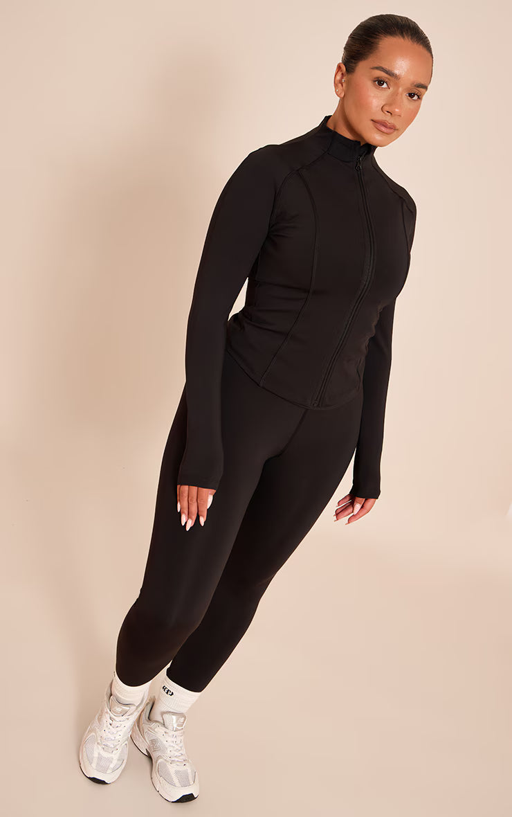 Refine your active-inspired wardrobe with the shape black sculpt seam detail long sleeve zip front jacket. Made from contouring sculpt fabric in jet black, it features structured seam detailing and a zip-up front for a flattering, fitted shape. Style with the coordinating leggings and chunky sneakers for a chic athleisure look.
