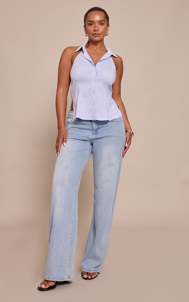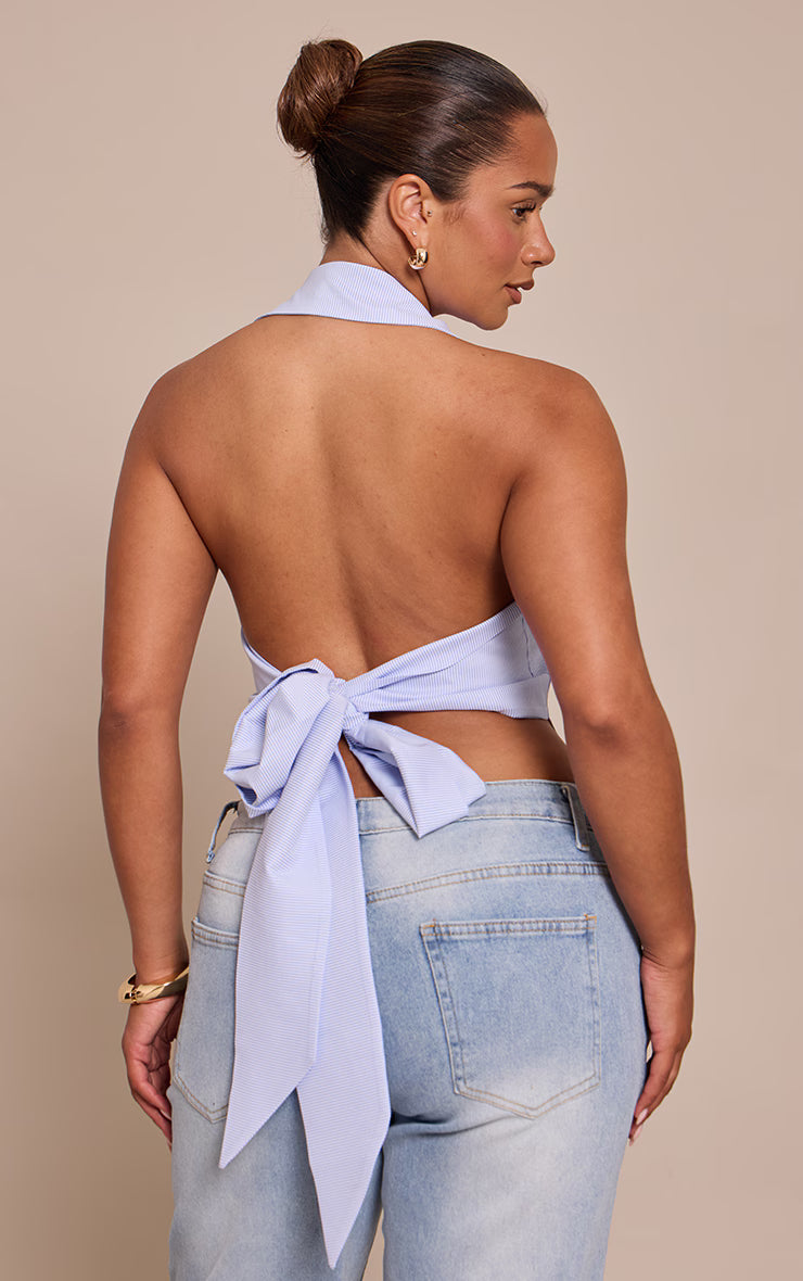 Reimagine classic shirting with a directional edge. The shape blue striped tie back button front shirt offers an artful take on a timeless pattern, featuring a sharp halter neckline that meets a distinct pointed collar. Its structured button-front creates a sleek line, while the cinched waist and subtle flare redefine the silhouette, finished with a thoughtful tie-back detail for an adjustable fit. Style this piece with high-waisted tailored pants for a polished day look, or keep it cool with relaxed denim. Elevate the ensemble with sleek white heels and finish with delicate gold earrings, ensuring a sophisticated, fashion-forward statement.