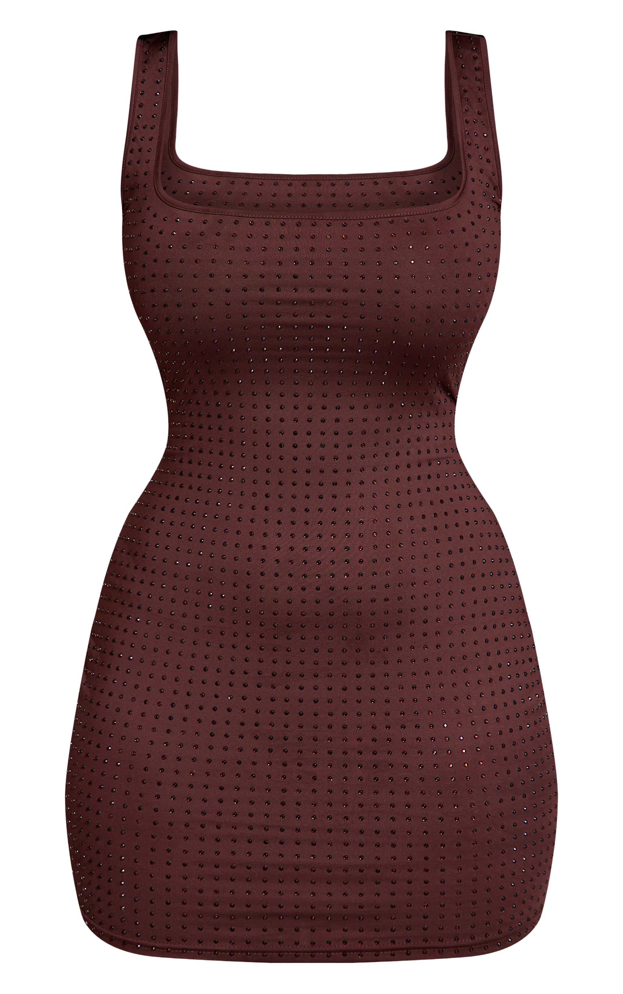 Shine through the night in the shape chocolate hotfix mini dress. Crafted from slinky stretch fabric in rich chocolate adorned with sparkling hotfix embellishments, this dress hugs your figure in all the right places. Pair with metallic heels for an ultra-glam finish.