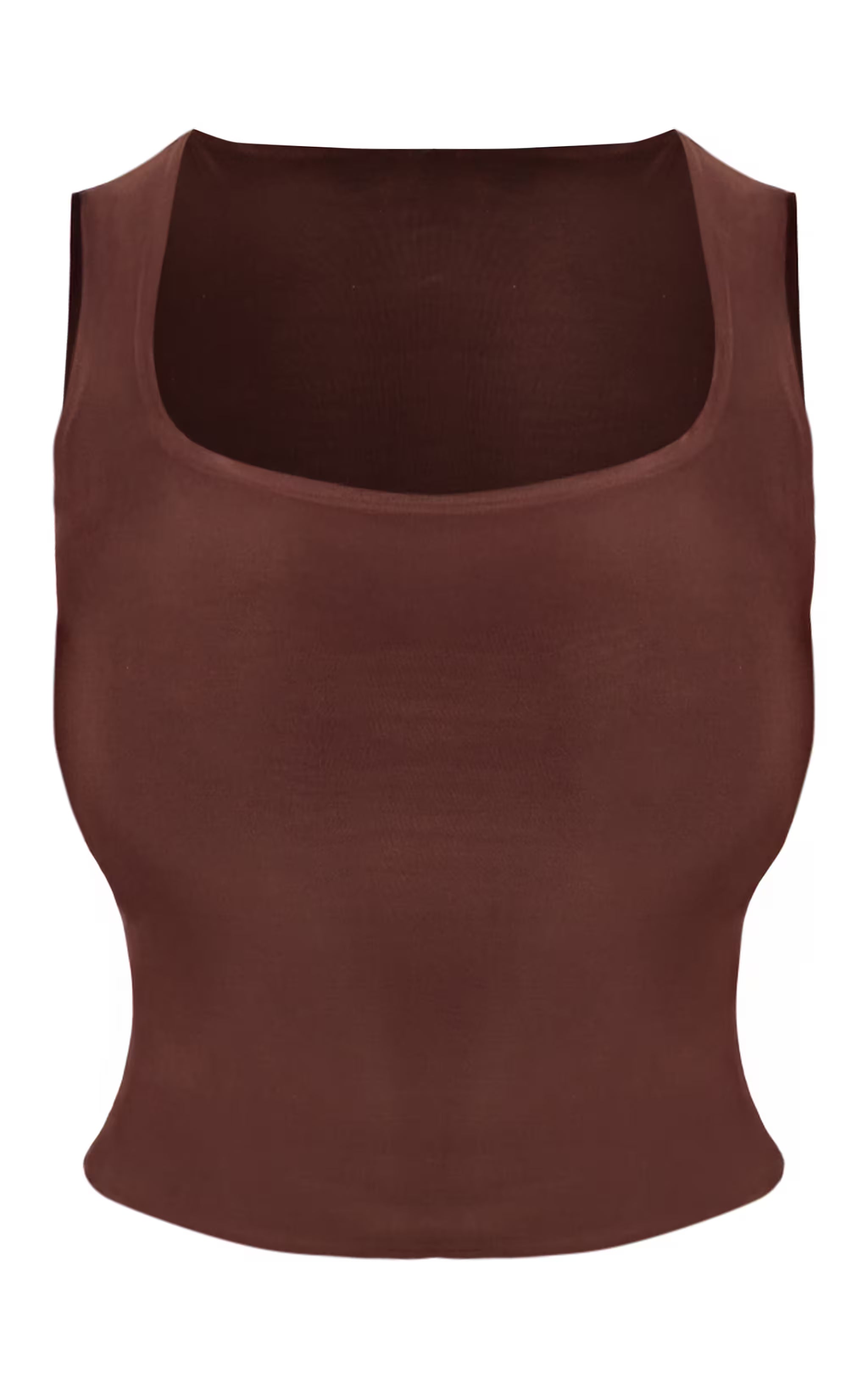 Master the art of subtle impact with a piece designed for effortless confidence. The shape chocolate slinky square neck top anchors your daywear, presenting a rich hue and a flattering square neckline that carves a modern profile. Its artful cropped length and close-cut design sculpt a sleek silhouette, making it an essential foundation for curated looks. Team it with wide-leg tailored pants for an assured ensemble, grounding the aesthetic with sleek ankle boots and completing your style with delicate gold earrings for an effortlessly polished statement.