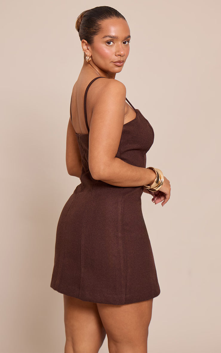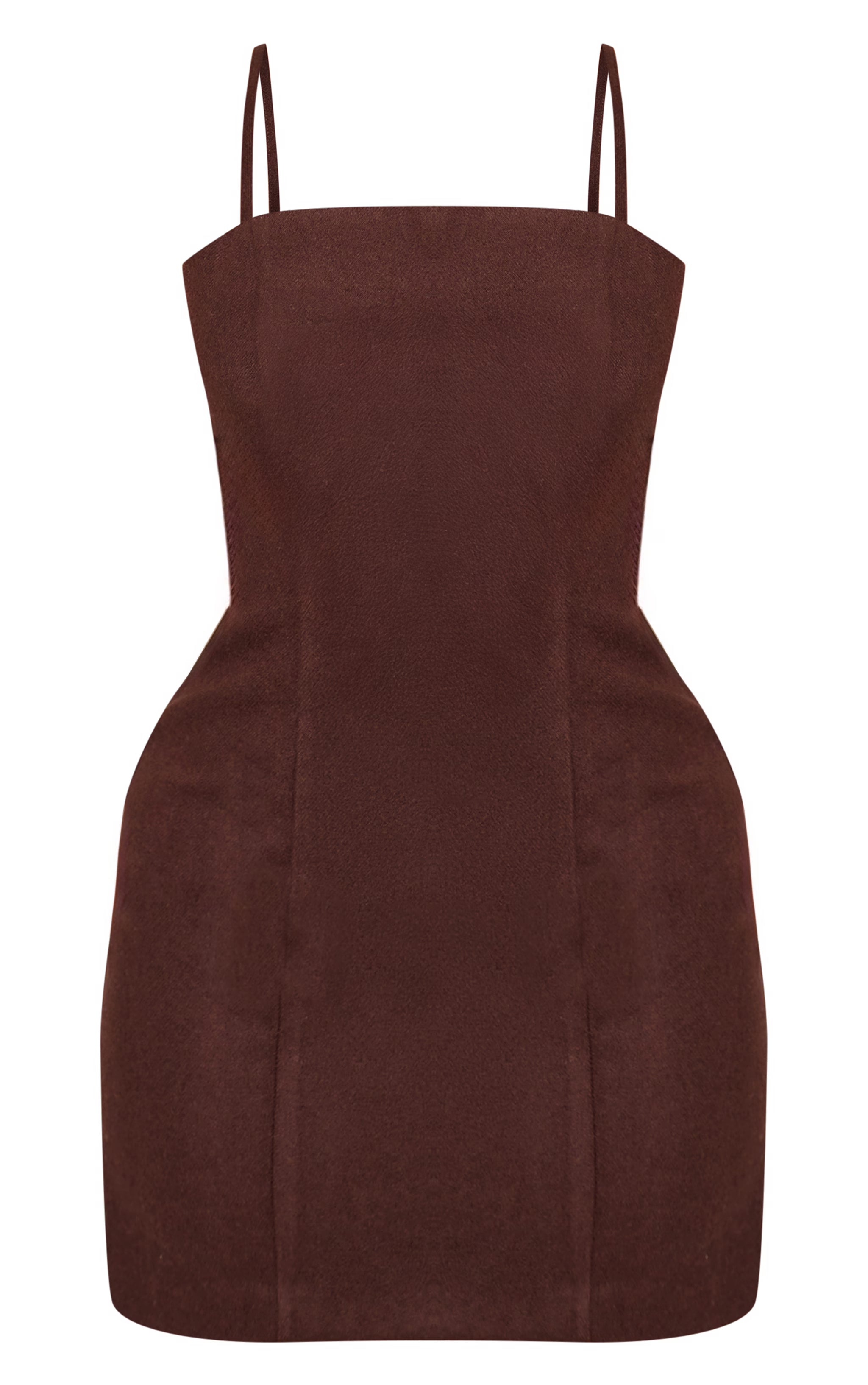 Embrace a refined edge with a piece designed to make an impact. The shape chocolate wool-look strappy mini dress delivers a sharp, minimalist aesthetic with its contemporary square neckline and delicate spaghetti straps. Precision tailoring is evident in the vertical seam details that contour the body, creating a confident mini fit. Complete this elevated piece with sleek heeled mules and a striking black bag, crafting an ensemble that navigates day-to-night transitions with effortless, self-aware style.