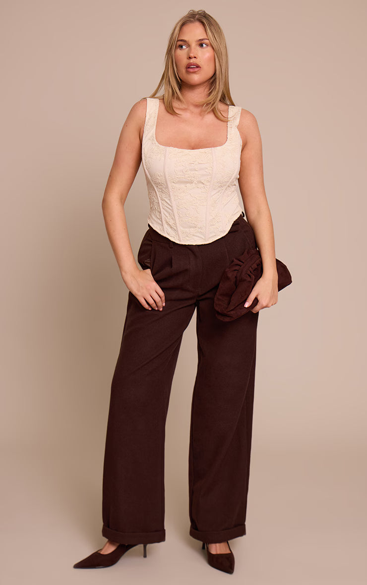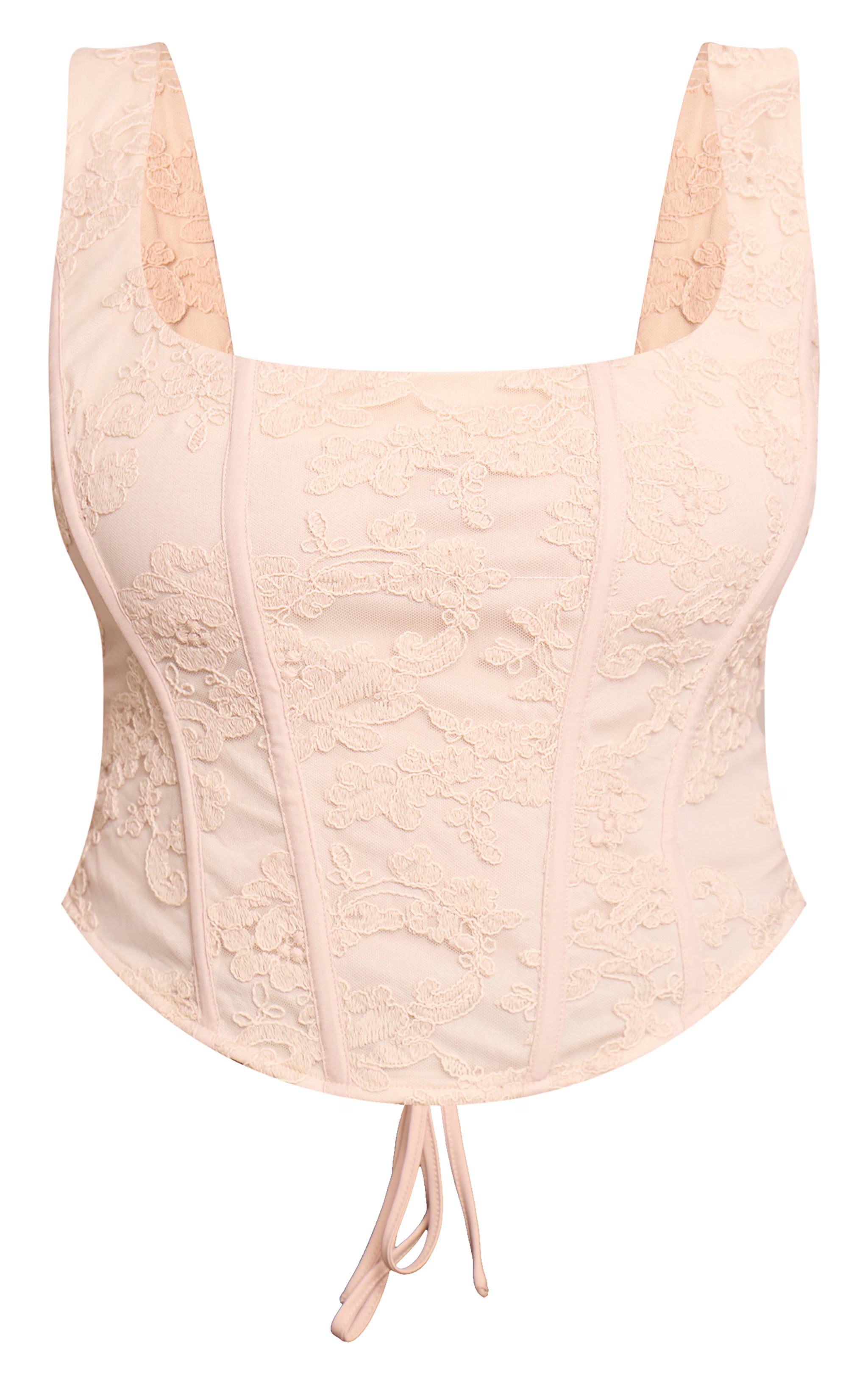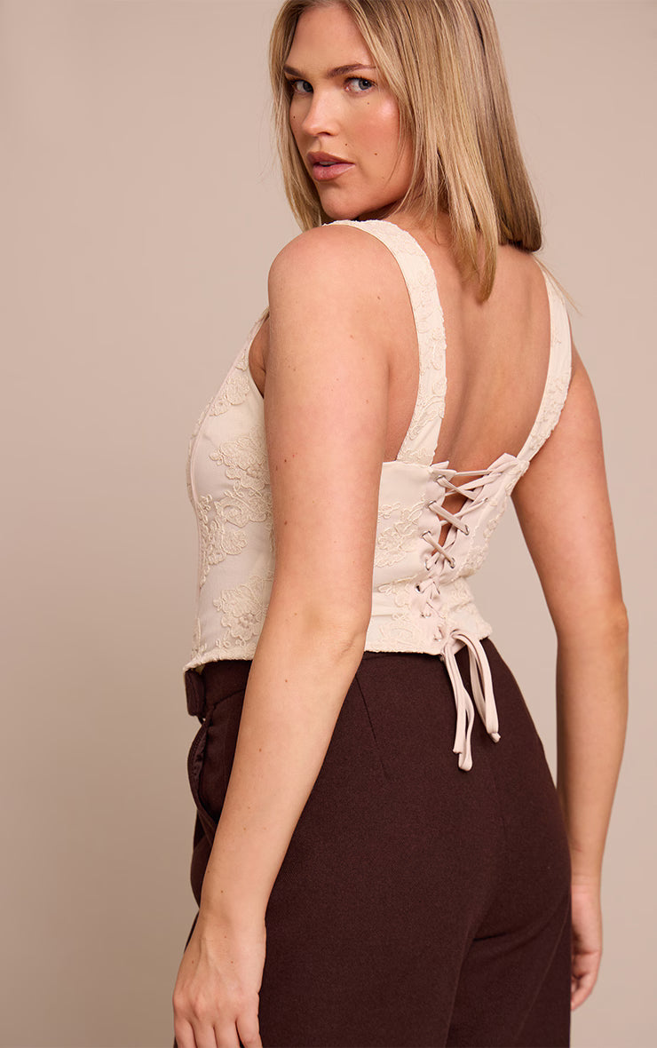 Curate an unforgettable occasion look with a piece that speaks volumes for elevated style. The shape cream textured floral lace up back corset top delivers a knowing edge, presenting a chic square neckline and wide straps that frame the colletage, alongside delicate embroidered floral patterning that adds visual intrigue. Its structured design contours the frame, finished with an artful lace-up back for a custom fit. Pair this sophisticated cream corset with sharply tailored wide-leg pants to balance its refined lines. Complete the look with sleek brown heels and subtle gold jewelry, ensuring an effortlessly artful and self-aware aesthetic, perfect for making your mark.