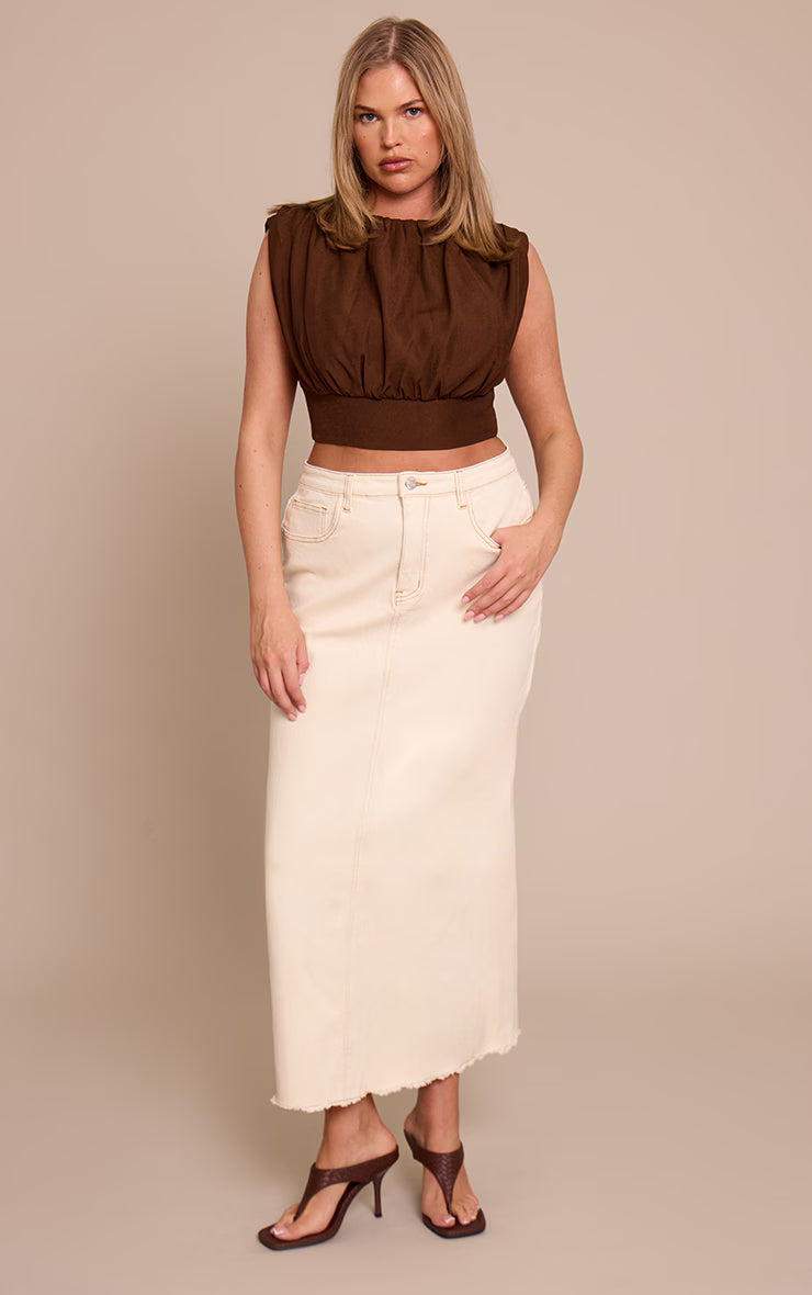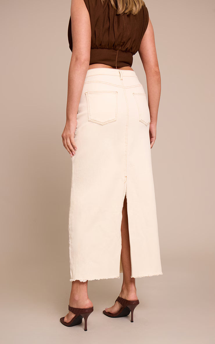 Refine your casual edit with the shape ecru stretch denim maxi column skirt. Made from smooth stretch denim in a neutral ecru shade, this skirt features a long column silhouette and high-rise fit. Pair with a simple tank top or cropped shirt for a polished off-duty style.