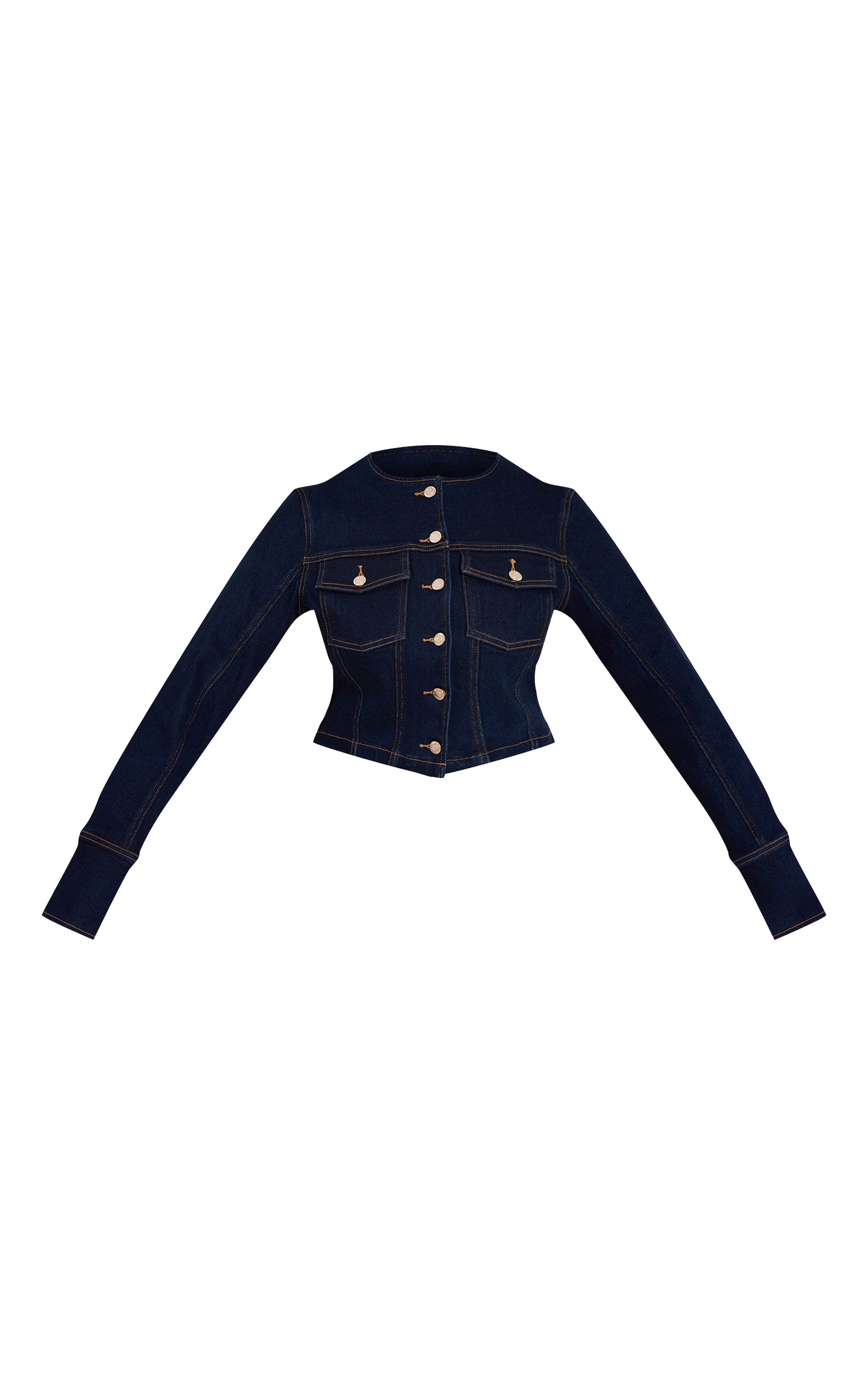 A new standard for evening denim has arrived. Our shape indigo stretch denim fitted jacket offers a distinct approach to after-dark dressing, featuring a sleek collarless round neckline and a precisely tailored, cropped silhouette that defines the waist. Its rich indigo wash is elevated by prominent gold-tone contrast stitching and a full front fastening of elegant silver buttons, complemented by artful flap chest pockets. For an undeniable evening two piece set, pair this statement jacket with its matching denim pants, grounding the ensemble with confident pointed heels. Complete your sophisticated look by adding some polished gold earrings for an aesthetic that’s impeccably put-together.