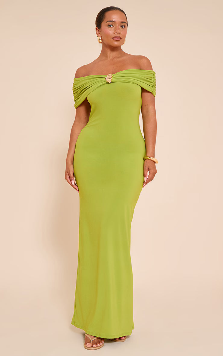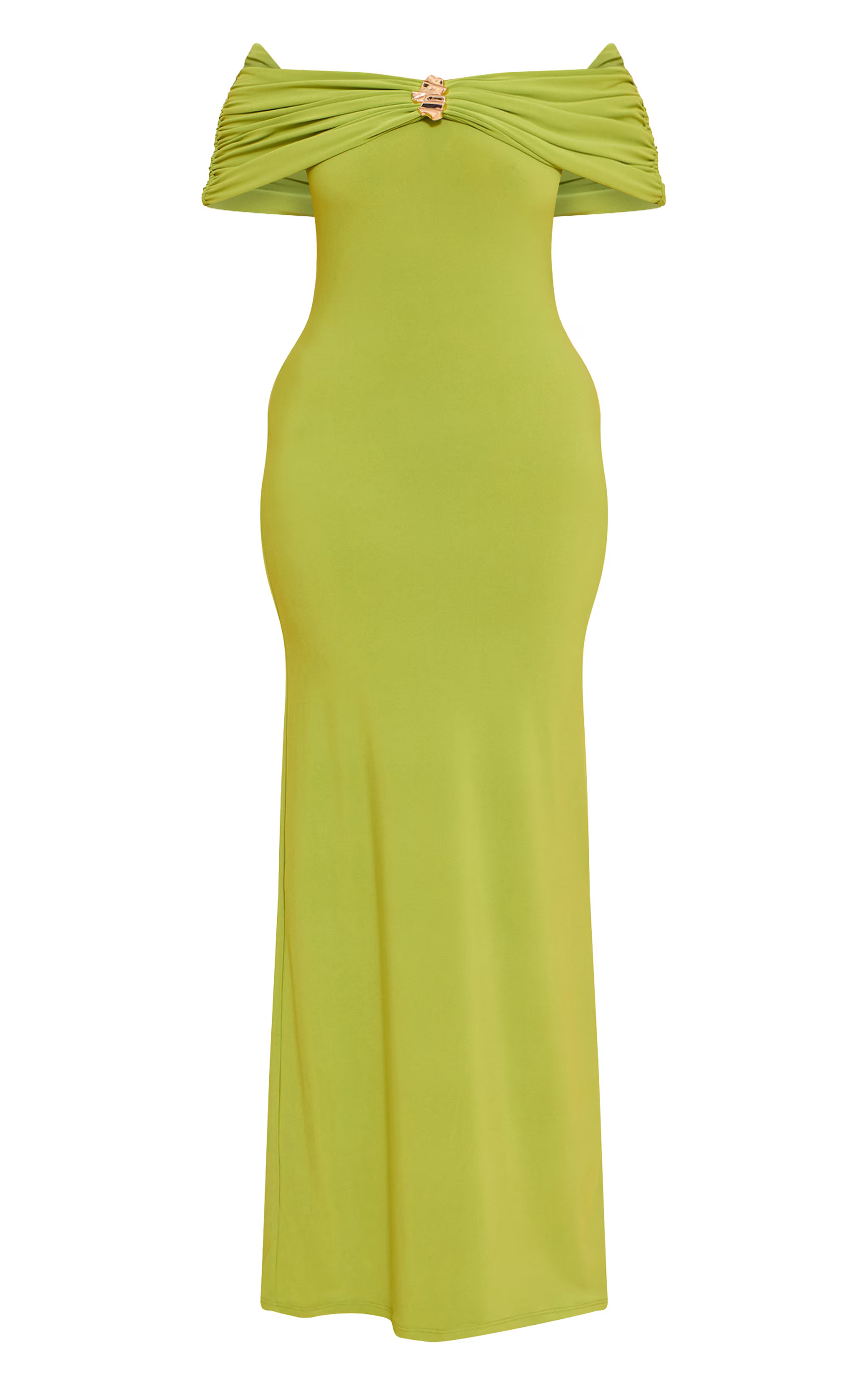 Define your evening agenda with a confident statement. The vibrant hue of the shape olive fold over bardot gold trim maxi dress instantly elevates your look, designed to sculpt the form with a sleek bodycon silhouette. Its elegant bardot neckline features an artful fold-over detail, cinched by a striking gold-tone clasp that anchors the design. This distinctive piece flows to a dramatic maxi length, ensuring an impactful presence. Complement this essential with sharp heeled sandals and a streamlined clutch bag, ready to command any room.