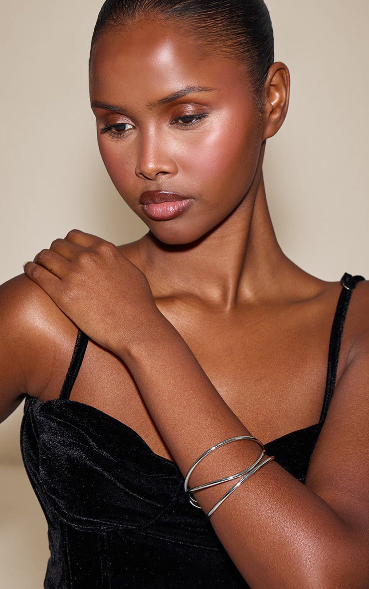 An artful curve, a modern finish – some accessories just get it. This silver abstract open bangle defines your evening aesthetic with its striking, fluid design. Multiple polished silver-tone bands artfully intertwine and curve around the wrist, creating a contemporary open silhouette that makes a confident impression. Pair this discerning piece with a sleek black midi dress and statement heels, crafting an ensemble that leaves a lasting impression. Complete your look with a minimalist black bag, for an evening aesthetic that’s impeccably polished and self-aware.