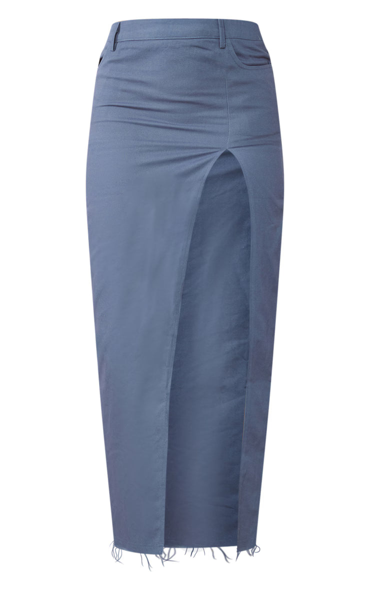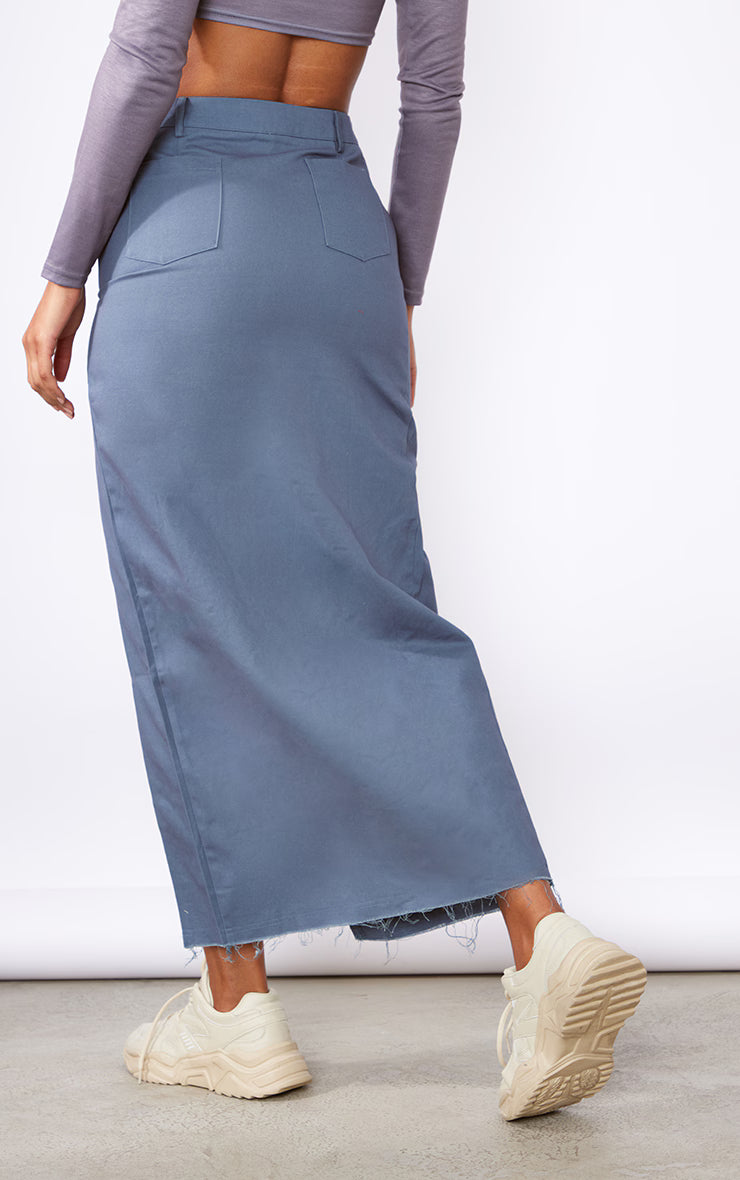 Don't compromise your style game this season, this steel blue twill split thigh midaxi skirt is for you. This skirt is brought to you in a steel blue twill material for a luxe touch we are obsessing over. With a split thigh design and a midaxi length, you are sure to stand out from the rest wherever you go. Team with a Graphic tee and some fresh sneakers to complete this effortlessly chilled look.