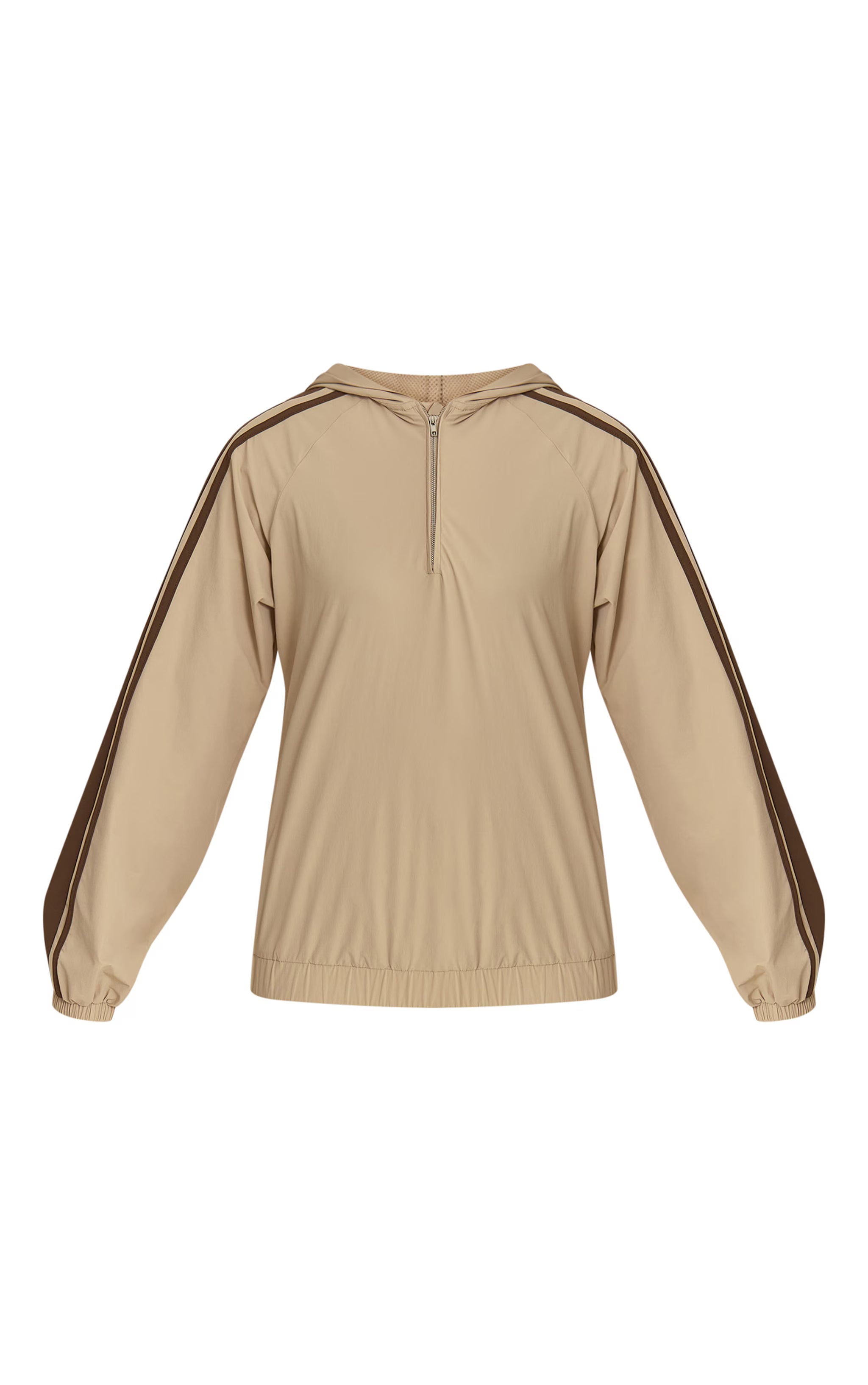The stone shell contrast stripe hooded track jacket is a neutral take on sporty chic. Its soft fabric and relaxed fit make it perfect for layering. Pair with the matching wide leg track Pants for a two piece set moment or with leggings and sneakers for off-duty style.