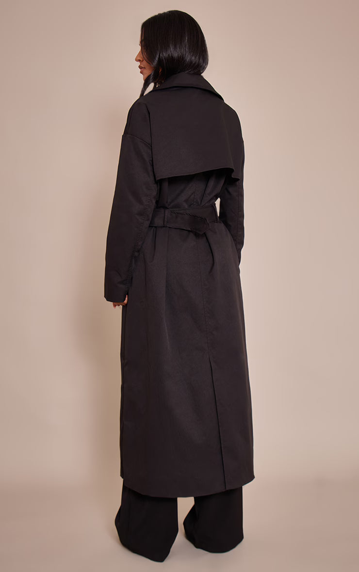 Stand out from the rest with this tall black tie waist trench coat. Brought to you in a black hue material with a tie waist giving you a flattering fit like no other. Team this trench coat with a pair of wide leg pants and a basic t-shirt to finish off the look.