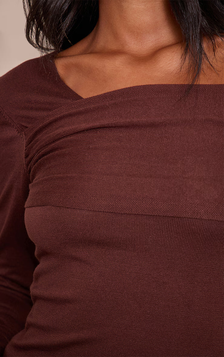 Own the moment with a piece that redefines daywear. The tall chocolate long sleeve asymmetric shoulder knitted top brings an artful edge to your collection, featuring a sophisticated off-shoulder design on one side, balanced by a neat long sleeve on the other. A dynamic folded detail across the décolletage adds an unexpected architectural element. Its rich chocolate hue offers a versatile foundation, while the precise cut ensures a streamlined silhouette. Pair this elevated knit with sleek tailored pants and classic ankle boots, then finish the look with a subtle gold ring for an understated yet impactful ensemble that speaks to modern confidence, effortlessly.
