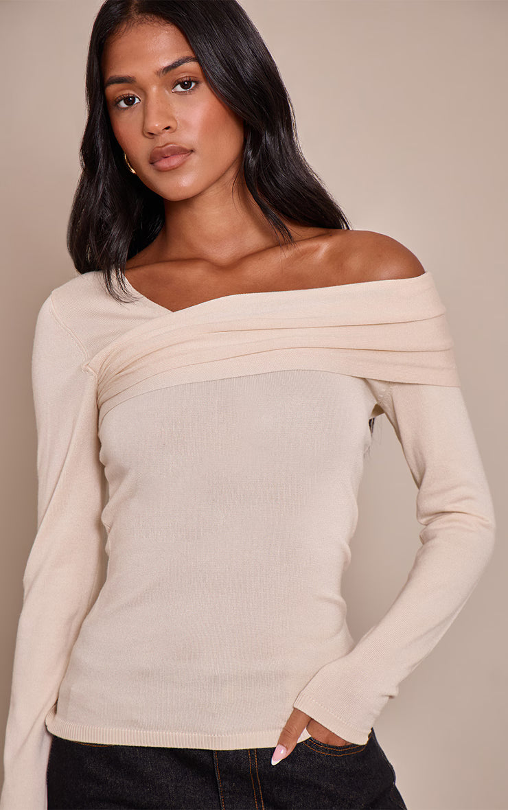 Make a subtle statement with directional knitwear that elevates the everyday. The tall cream long sleeve asymmetric shoulder knitted top features a beautifully draped, deconstructed neckline, showcasing a confident, off-kilter shoulder for an instantly artful profile. This cream long sleeve piece offers sophisticated simplicity, ideal for effortless day styling. Team yours with tailored pants or a sleek mini skirt, grounding the look with polished boots and understated gold earrings for a poised and polished finish.