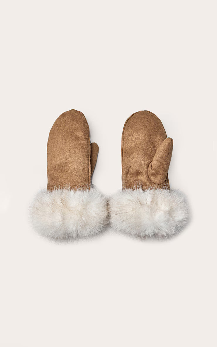 Own your winter edit with a confident touch, courtesy of the tan faux suede fur trim mittens. These essential accessories feature a distinctive faux suede body, elegantly finished with a contrasting white faux fur cuff that adds an artful flourish to your cold-weather ensemble. For a day look that’s undeniably put-together, team these with a chic tailored coat and your favorite pants, grounding the aesthetic with sleek western boots. Complete the vibe with a pair of sharp black sunglasses, ensuring your style statement is both knowing and effortless.