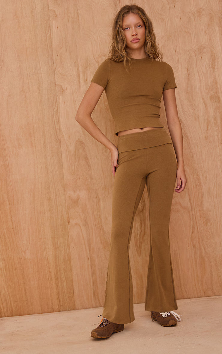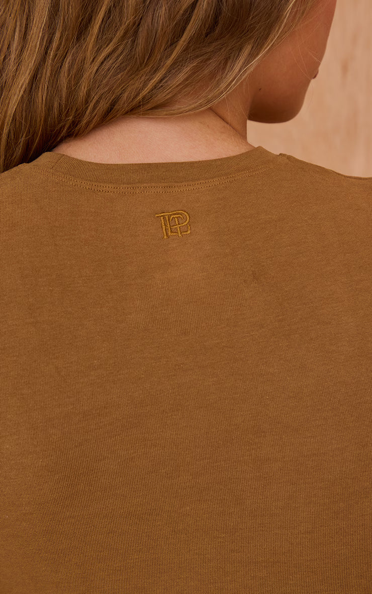 The tan melange soft cotton short sleeve top is a versatile staple for your wardrobe. Lightweight and comfy, it pairs effortlessly with multiple bottoms. Style with high-waisted jeans and sneakers for casual days or layer under a blazer for relaxed sophistication.
