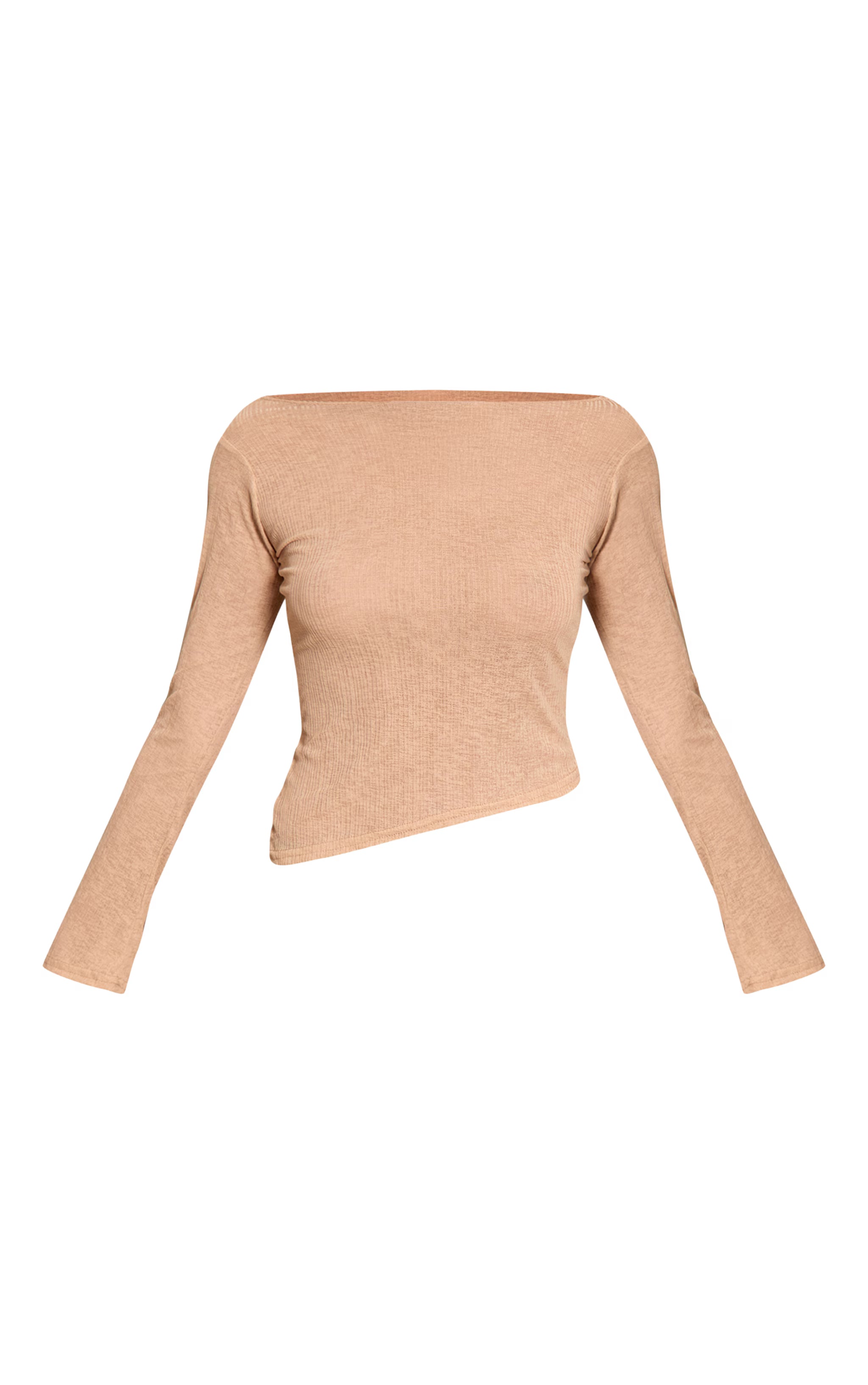 Own your aesthetic from the moment you step out. The tan onion skin rib bardot flare sleeve top offers an elevated take on day dressing, featuring a flattering off-shoulder neckline and long sleeves. Its contemporary cropped cut with an asymmetric hem delivers an undeniable edge. Style this piece with tailored black pants, sleek ankle boots, and understated gold jewelry for a refined daytime look that speaks volumes.