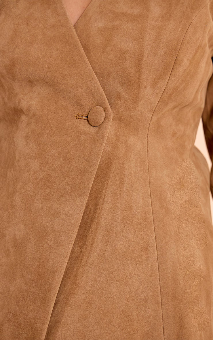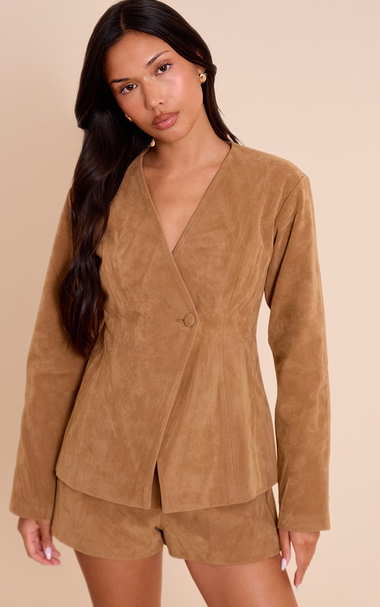 Command attention with a modern take on tailoring. This tan structured faux suede cinched waist blazer is the ultimate power piece, featuring a sophisticated V-neckline and a flattering wrap design secured by a single central button that sculpts the waist. Its long-sleeved, structured cut makes it ideal for building chic two piece set looks with matching shorts or sleek tailored pants. Complete your ensemble for an evening out with sharp knee-high boots and a minimalist clutch bag, ensuring every detail exudes a refined, self-assured vibe.