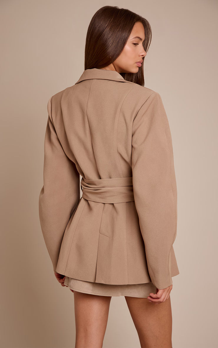 Command the room with undeniable ease. The taupe gathered wrap waist belted blazer takes classic tailoring into a new dimension, presenting a V-neckline flanked by wide, sophisticated lapels. Its silhouette is dramatically shaped by broad shoulders and an artful gathered wrap waist, cinched by a coordinating self-tie belt that defines the figure with an unconventional flair. The design finishes with a confident, asymmetric hem that suggests movement and modern appeal. This piece truly comes alive for evening when styled with sleek black tailored shorts or even a minimal mini skirt, creating a cohesive, impactful ensemble. Ground your look with chic mule heels and a pair of statement gold earrings, ensuring a polished yet formidable aesthetic.