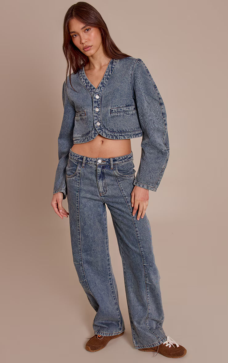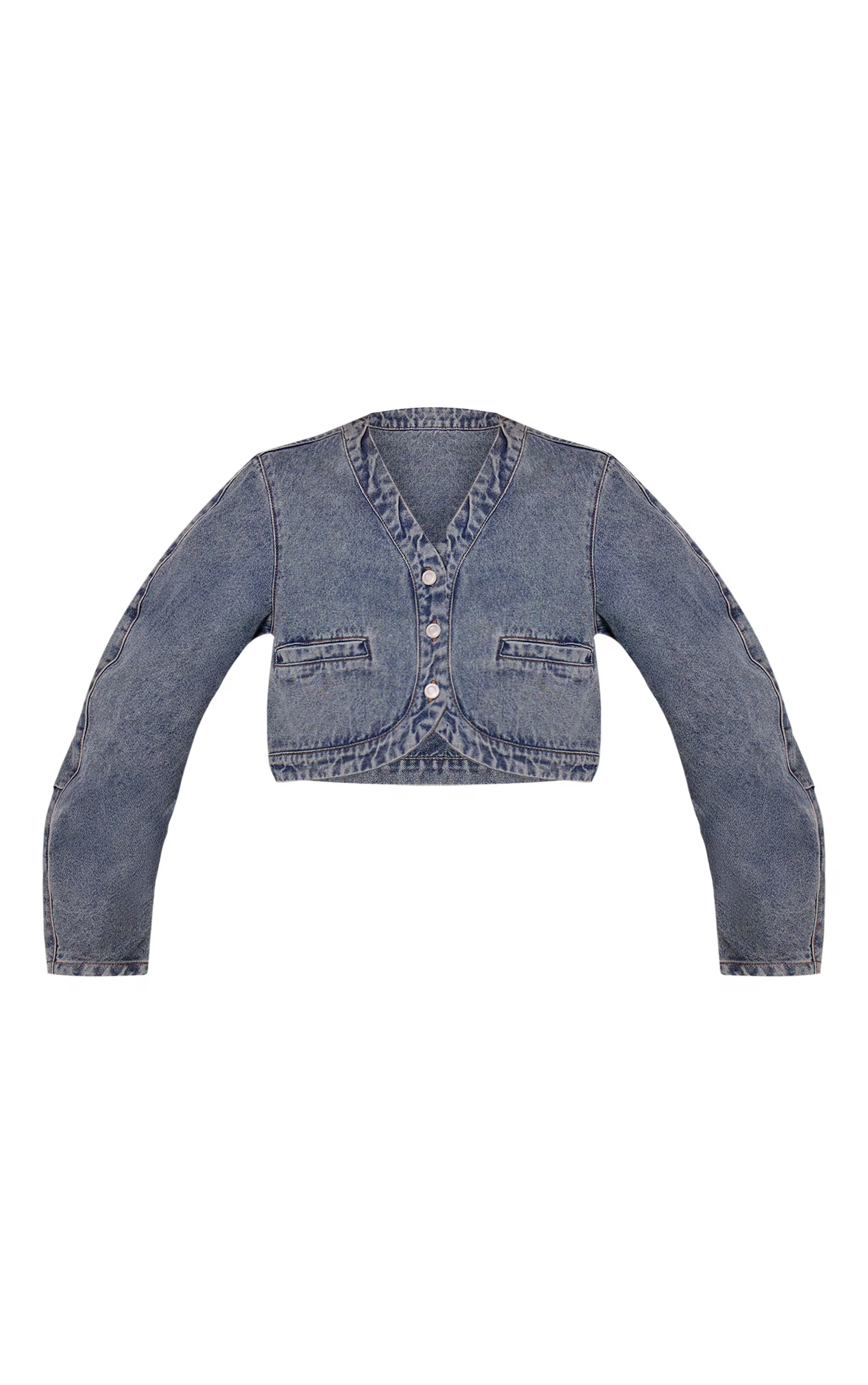 Reimagine your denim edit with a piece that blends classic appeal and a contemporary cut. This discerning `vintage v neck curved hem cropped denim jacket`, presented in a true vintage wash, offers a flattering v-neckline and a distinctive curved hem, defining its modern cropped silhouette. White button fastenings provide a polished contrast, complemented by subtle flap pockets and full sleeves that gather gently at the cuff. For an artful day look, style yours alongside high-waisted pants or the coordinating denim for a cohesive statement. Elevate the ensemble with sleek `kitten heels` and finish with a structured `black bag` for an effortlessly curated aesthetic.