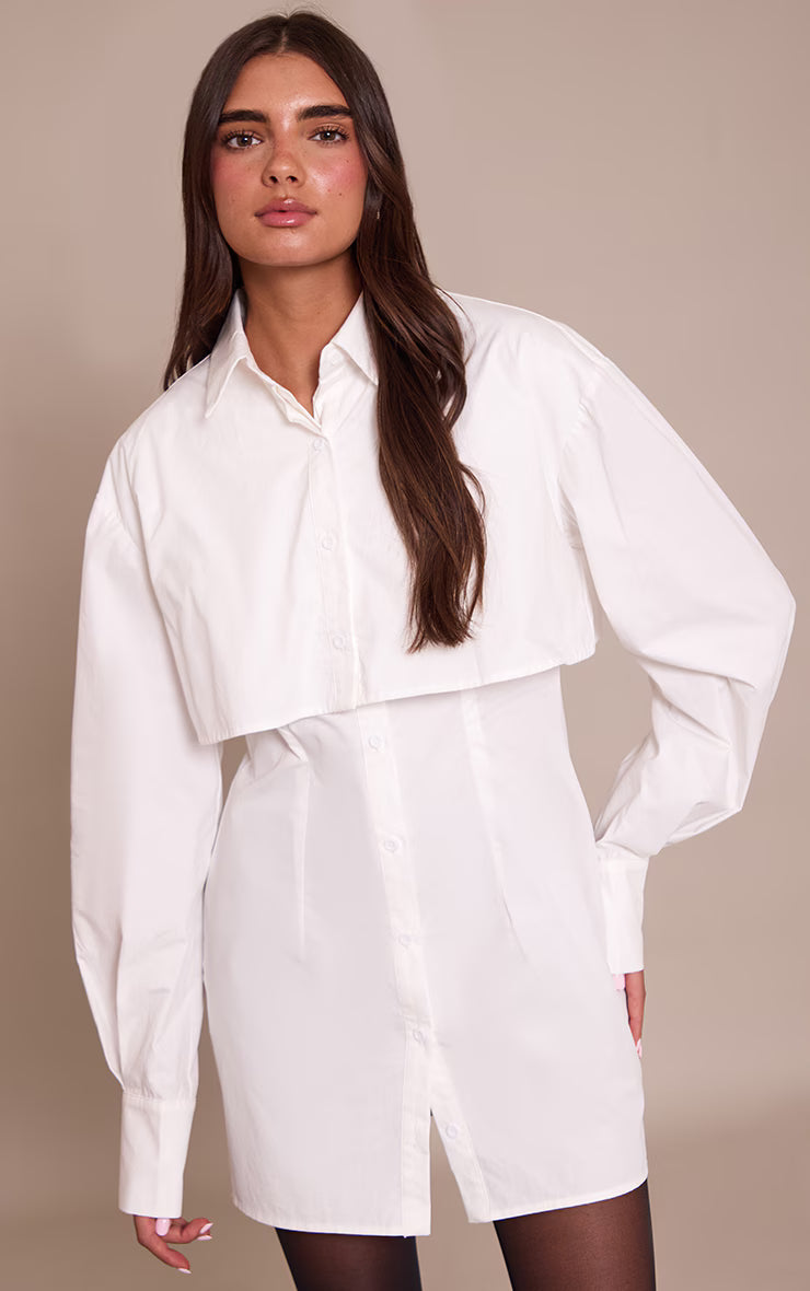 The white overlay detail long sleeve shirt dress redefines classic tailoring with a modern twist. Its overlay feature adds structure and depth while maintaining a clean, sophisticated silhouette. Style with knee-high boots and a trench coat for a chic transitional outfit.