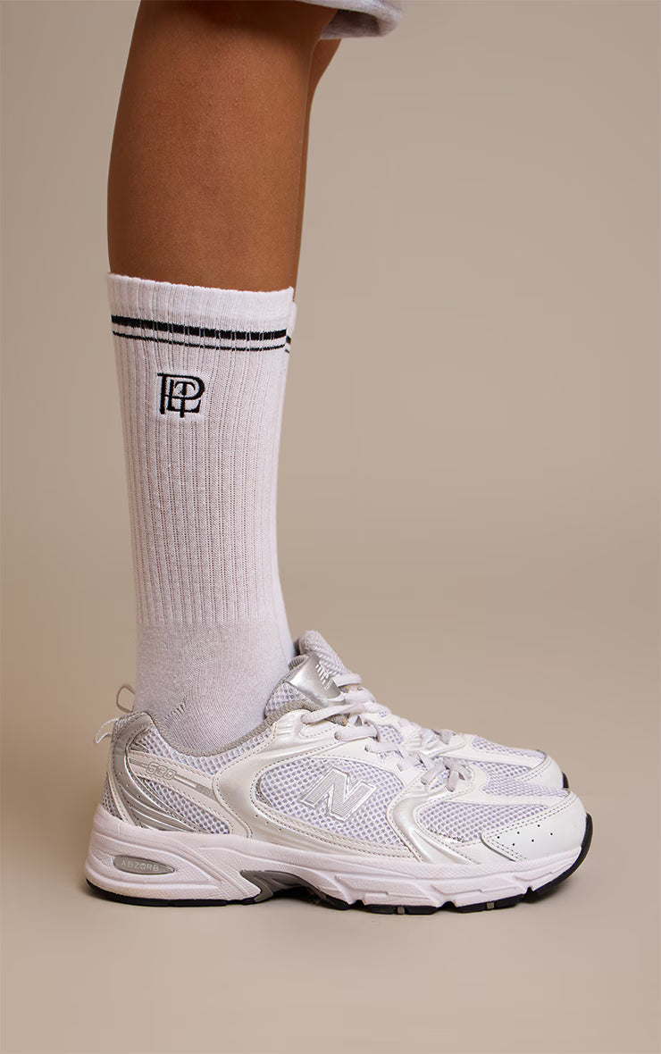 Complete your off-duty essentials with the white PrettyLittleThing embroidered sports socks. Crafted from a soft cotton blend in a fresh white hue, these socks feature an embroidered PrettyLittleThing logo for a branded finish. Perfect for everyday wear, pair them with your favorite sneakers or chunky loafers for a sporty edge.