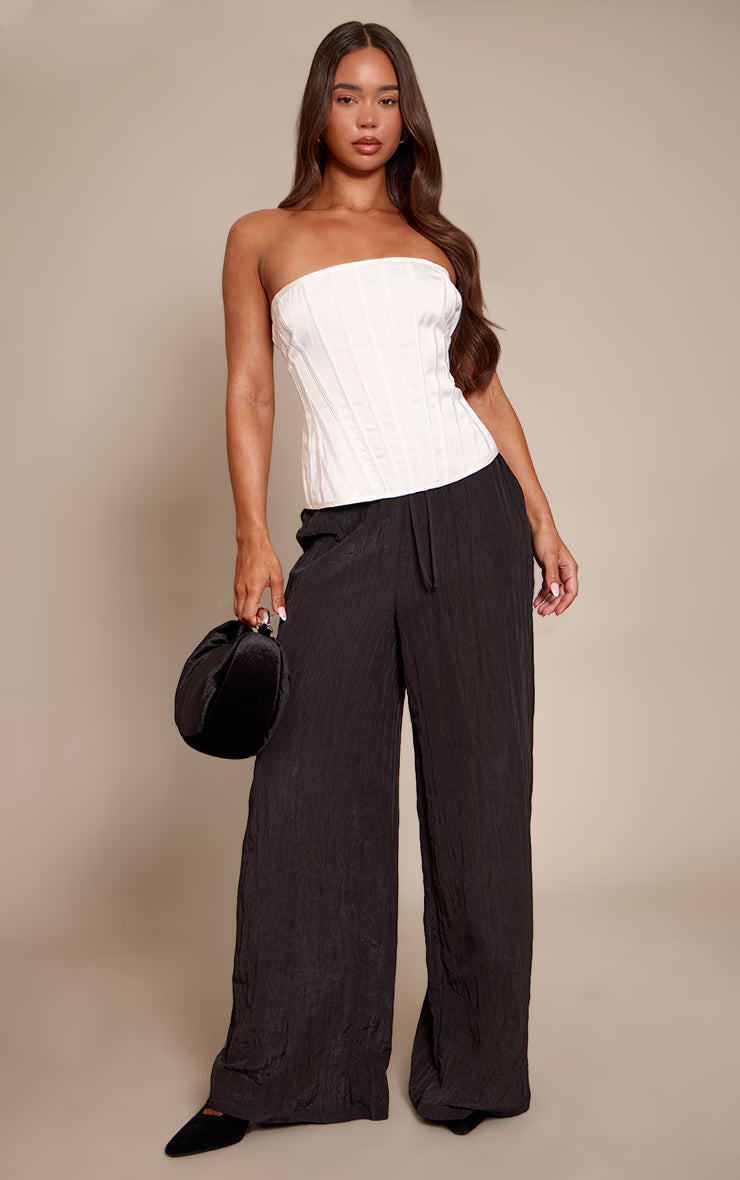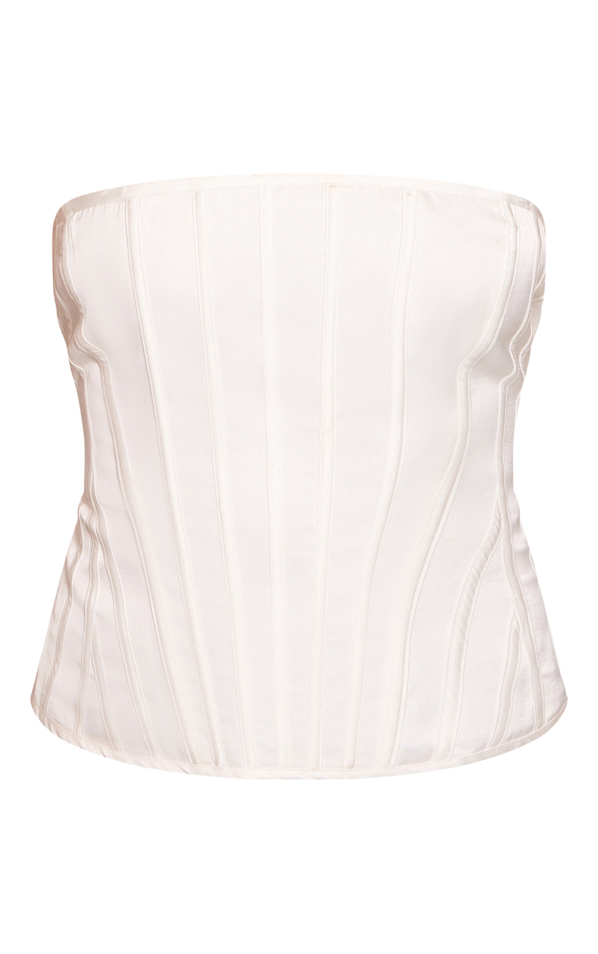 An unapologetic silhouette designed for striking impact, the white satin boned bandeau corset defines your evening aesthetic, featuring sharp boning detail that confidently shapes the form and a sleek bandeau neckline. Its crisp white satin-look finish offers an undeniable presence. Pair this elevated piece with wide-leg tailored pants for a modern contrast, grounding the ensemble with sharp black heels and a minimalist gold ring, asserting a sophisticated confidence that's truly your own.