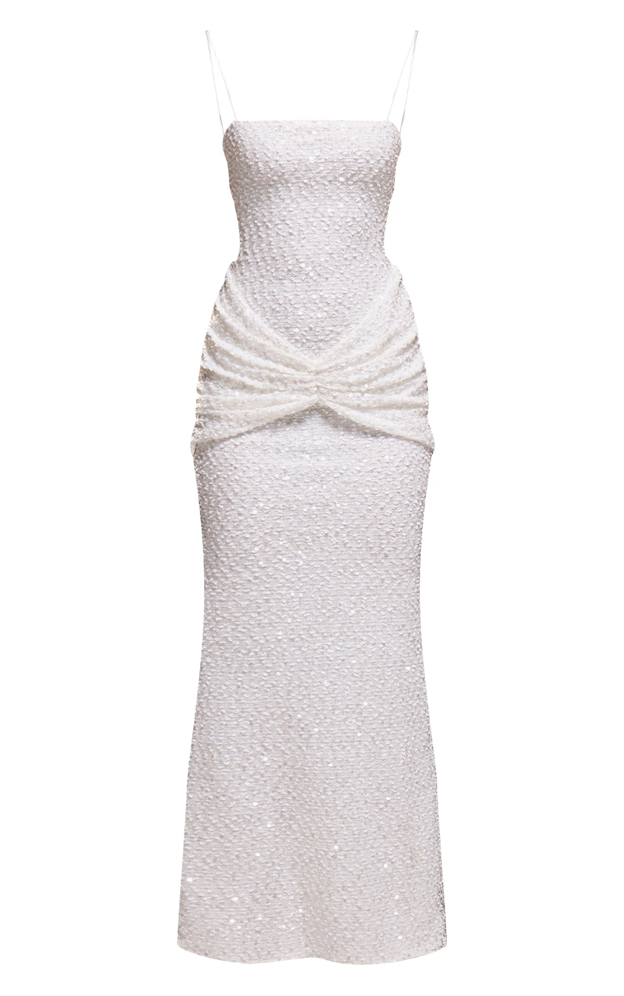 Make an unforgettable entrance in the white sequin wrap detail strappy maxi dress. This arresting piece features a sleek silhouette, delicate strappy detailing, and artful ruching across the bodice that culminates in a statement knot. The all-over sequin embellishment ensures you’ll capture the light from every angle, making it the perfect choice for your next special occasion. Elevate the look with dazzling white heels and a chic clutch bag for a truly show-stopping ensemble.