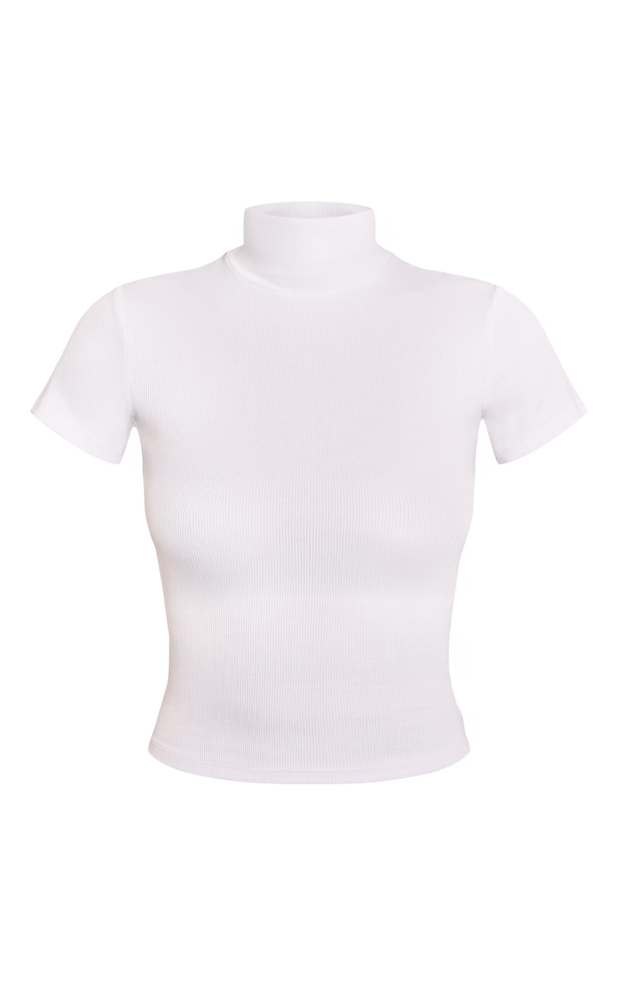 Anchor a discerning wardrobe with a foundation piece that effortlessly elevates. This essential white soft rib high neck fitted longline t-shirt boasts a sleek high neckline and classic short sleeves, creating a streamlined profile that defines every look. Its distinctive rib offers subtle visual interest without compromising its versatile shape. For a confident day aesthetic, wear this t-shirt tucked into tailored high-waisted pants or with a sharp mini skirt, then complete your ensemble with sturdy boots and a chic black shoulder bag to solidify your discerning approach to fashion.
