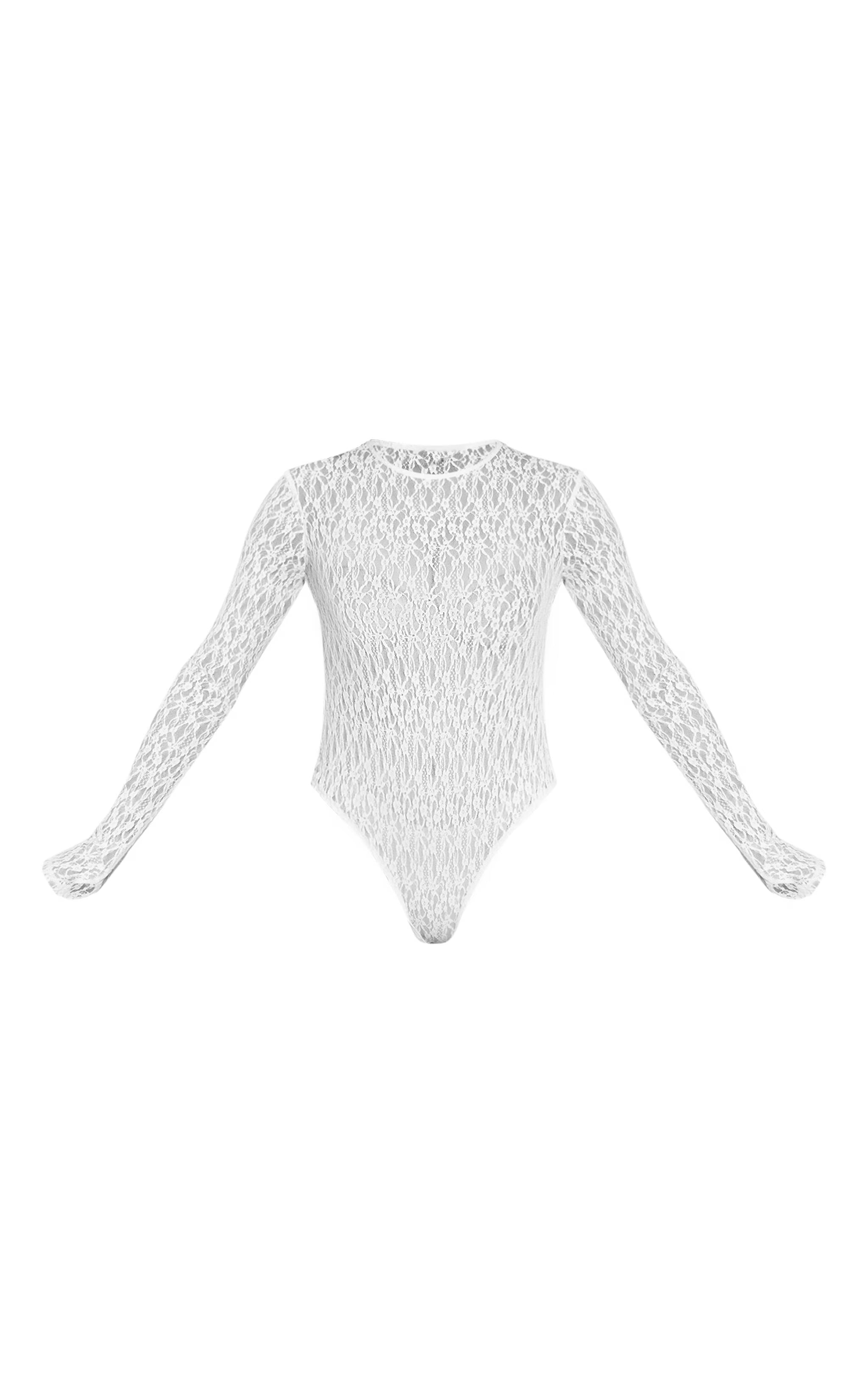Introduce knowing design into your evening edit with the white textured sheer lace long sleeve bodysuit. This essential layering piece features a delicate sheer lace construction, offering a high round neckline and streamlined long sleeves that promise a refined silhouette. Perfect for making a confident statement, style this bodysuit with tailored wide-leg pants for a sharp, sophisticated look, then complete your ensemble with sleek gold heels and subtle pearl earrings. This combination ensures an effortlessly artful presence that's uniquely yours.