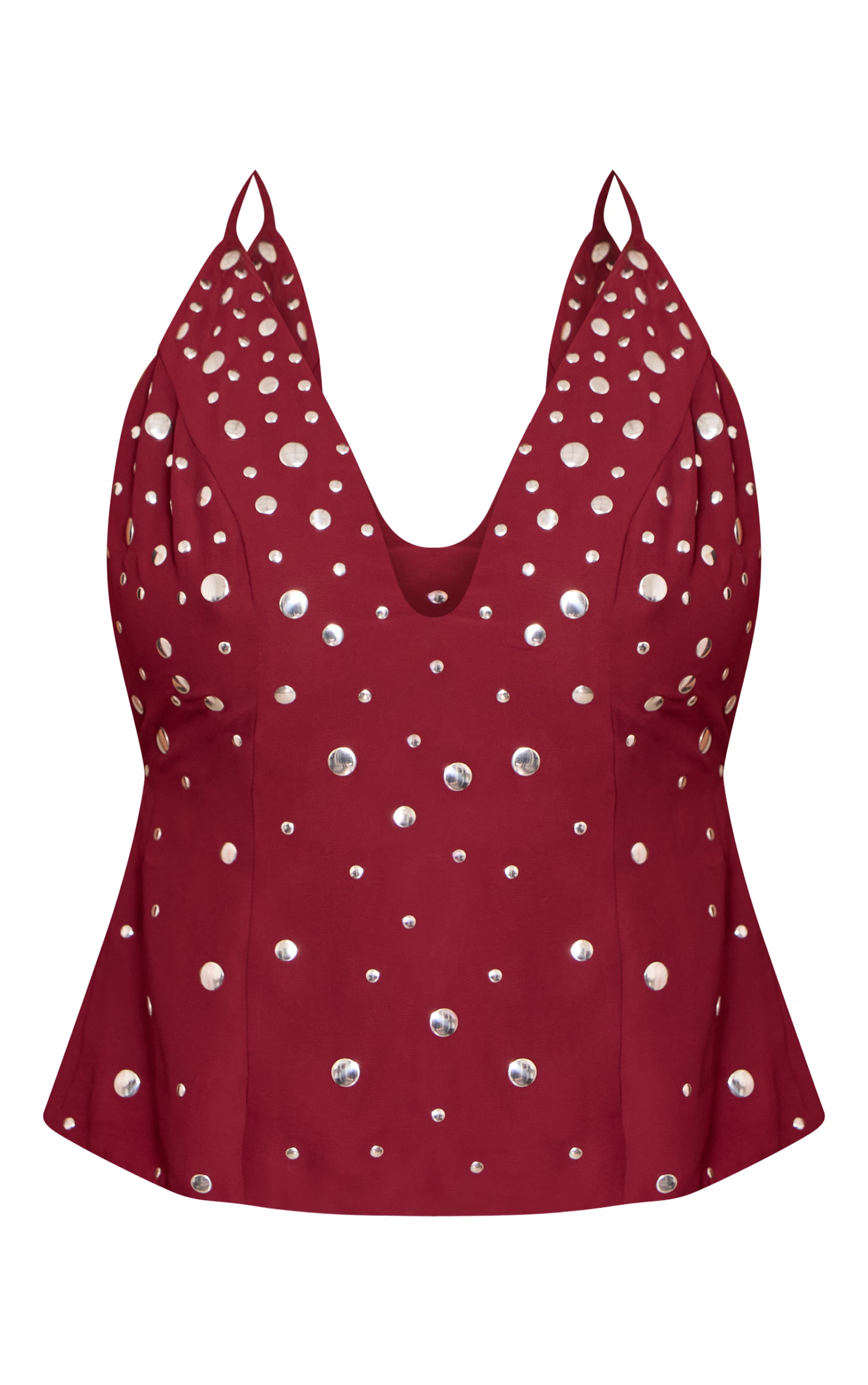 Command attention with every turn. The wine chiffon studded halterneck top delivers a distinct evening statement, showcasing a plunging V-neck and a halterneck design that frames the décolletage. Its all-over silver stud embellishments catch the light with subtle sparkle, while the structured bodice subtly flares at the hem for a refined silhouette. Pair this standout piece with tailored black pants and sleek high heels to lengthen the look. Elevate the ensemble further with a pair of delicate drop earrings, ensuring your aesthetic is truly complete for any evening event.