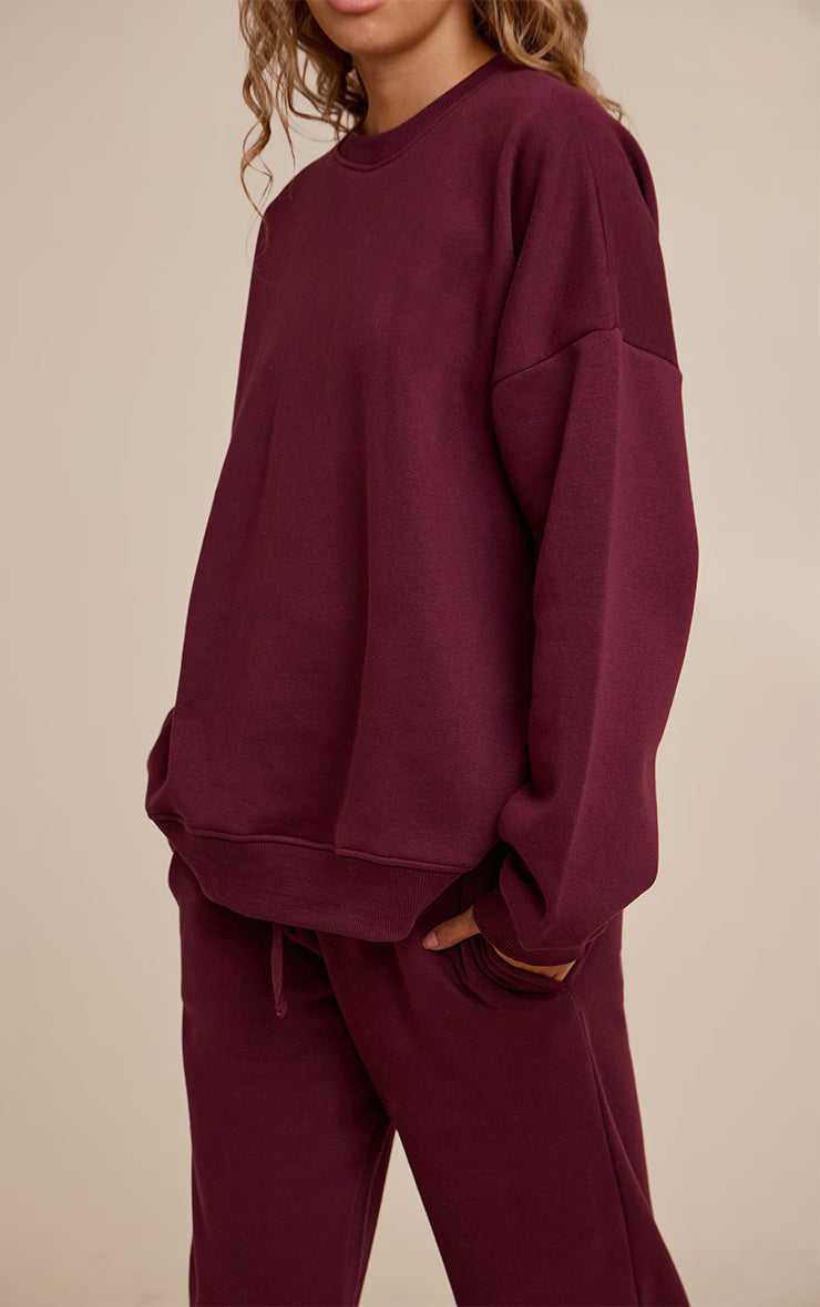 Elevate your off-duty wardrobe with the wine oversized sweat tracksuit set. Crafted from wine toned soft cotton material, this two piece set features a relaxed-fit Sweatshirt and matching wide-leg sweatpants for ultimate comfort. Style with chunky sneakers and a trench coat for an effortlessly chic casual look.
