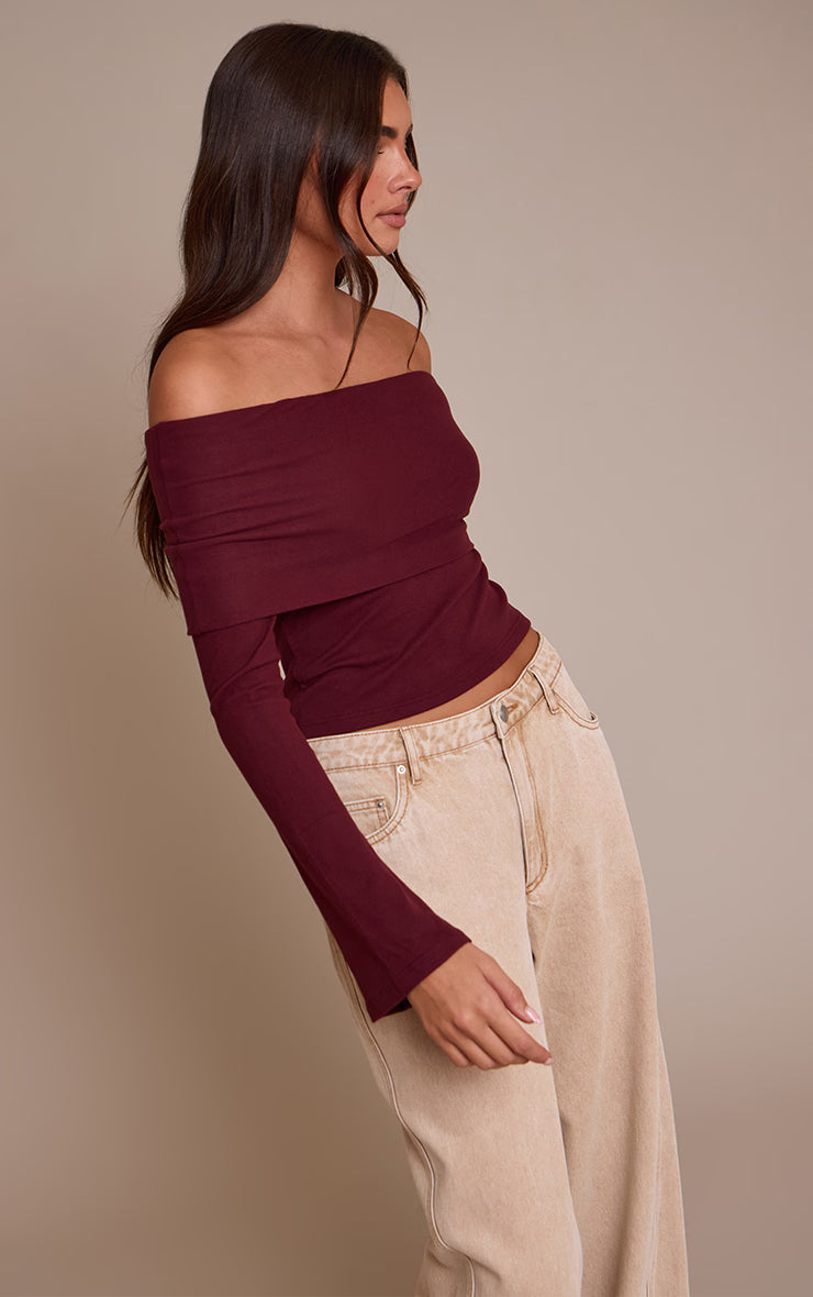 Make a statement without trying too hard. The wine ultra soft deep foldover bardot long sleeve top redefines daywear with its elegant off-shoulder neckline and sophisticated deep foldover detail. Its long sleeves and cropped cut create a modern silhouette, perfect for commanding attention. Pair it with high-waisted tailored pants, classic boots, and subtle stud earrings for an elevated day look that transitions effortlessly.