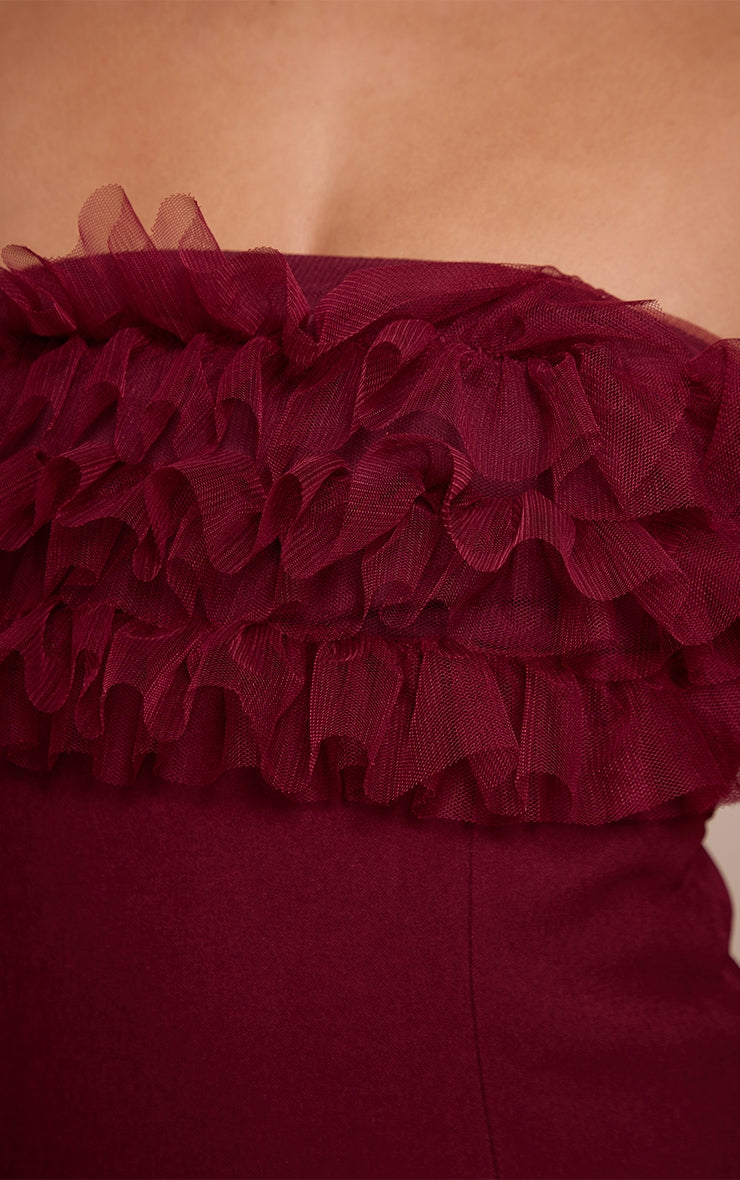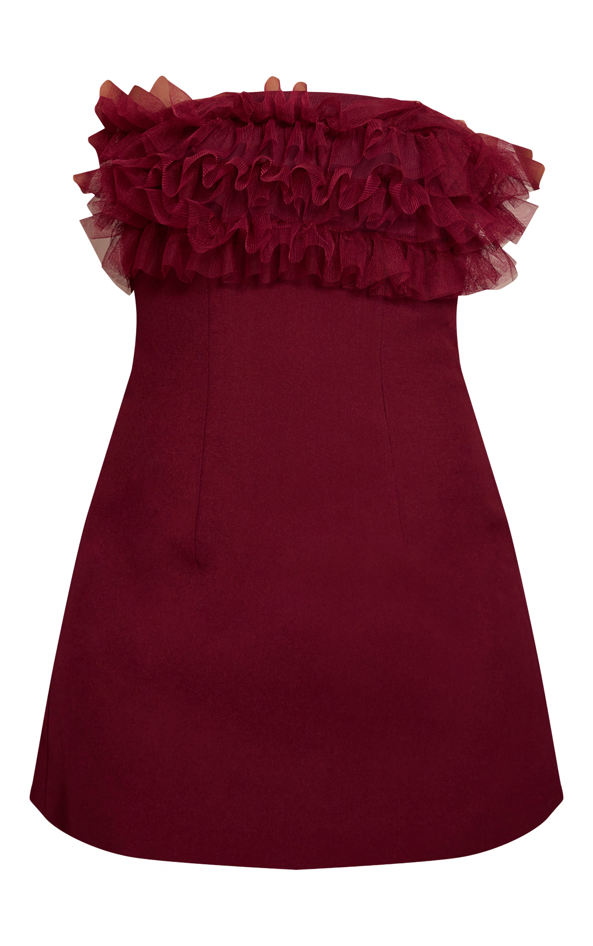 Catch every eye with an undeniable presence. The wine woven ruffle bandeau shift dress is engineered for impact, featuring a striking bandeau neckline adorned with layered ruffles that lend an artful dimension to its sleek, mini-length silhouette. This effortlessly confident piece makes a statement without trying too hard, perfect for any occasion demanding a knowing touch. Complete your look with elegant brown heels and a stack of gold bracelets, letting the dress speak volumes for itself.